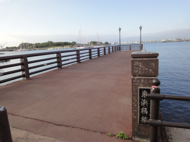 日和坂を下ってまっすぐ海に向かうとこの桟橋に行き着きます。かつて使用されていた木製の桟橋をコンクリート製に整備して残してあるそうです。周囲に当時を偲ぶものは見当たりませんでしたが、現在の東浜桟橋は夜景のスポットなのだそうです。昼間でもベイエリアの素敵な風景を一望するのにいいポイントとなっていました。