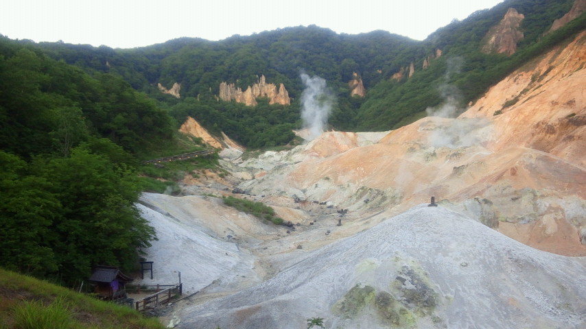 登別温泉は泉質(9種類)も抜群ですが、温泉街が土産屋、ホテル、飲食店などに両脇を押さえられ、それを抜けると地獄谷へ辿り着くという、歩いて楽しめるつくりとなっています。
