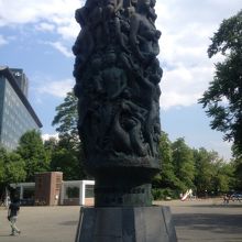 円柱に子供を抱く母、少年、数々の動物などの彫刻で浮きあがるように彫られているのが特徴です。