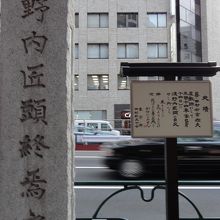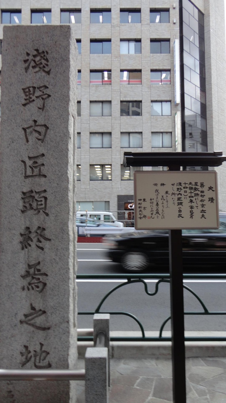 日比谷通り沿い新橋4丁目交差点近くに、碑が建てられています。江戸時代、この辺りは、一関藩の上屋敷があったそうで、その屋敷で浅野内匠頭が切腹したことから、ここに碑が建てられたようです。都の指定文化財になっています。