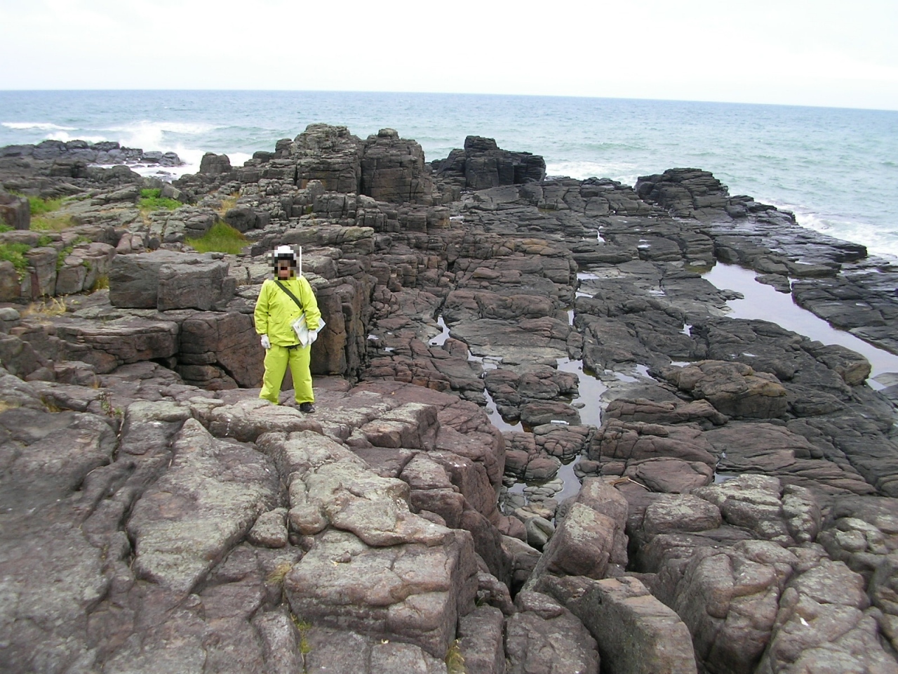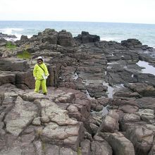 「ウスタイベ千畳岩」は、枝幸の市街から国道238号線を北に2~3km走ったウスタイベ岬にあります。ウスタイベ岬は視界を遮るもののない、だだっ広い平原で、その先端の海辺に一面に畳を敷き詰めたような平たい岩場が広がっており、自由に周辺も歩くことが出来ます。“千畳岩”と言うのはちよっと大げさかなと思いました。