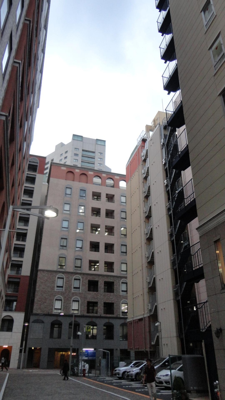 汐留の高層ビルの林立する地域と、JRの高架を挟んで西側にヨーロッパ風の建物が並ぶ一角があります。JRAのヨーロッパ風の建物と明るい色の建物が並び、イタリアンレストランや、オープンカフェ、ヨーロッパ風のコンビニなどがあります。