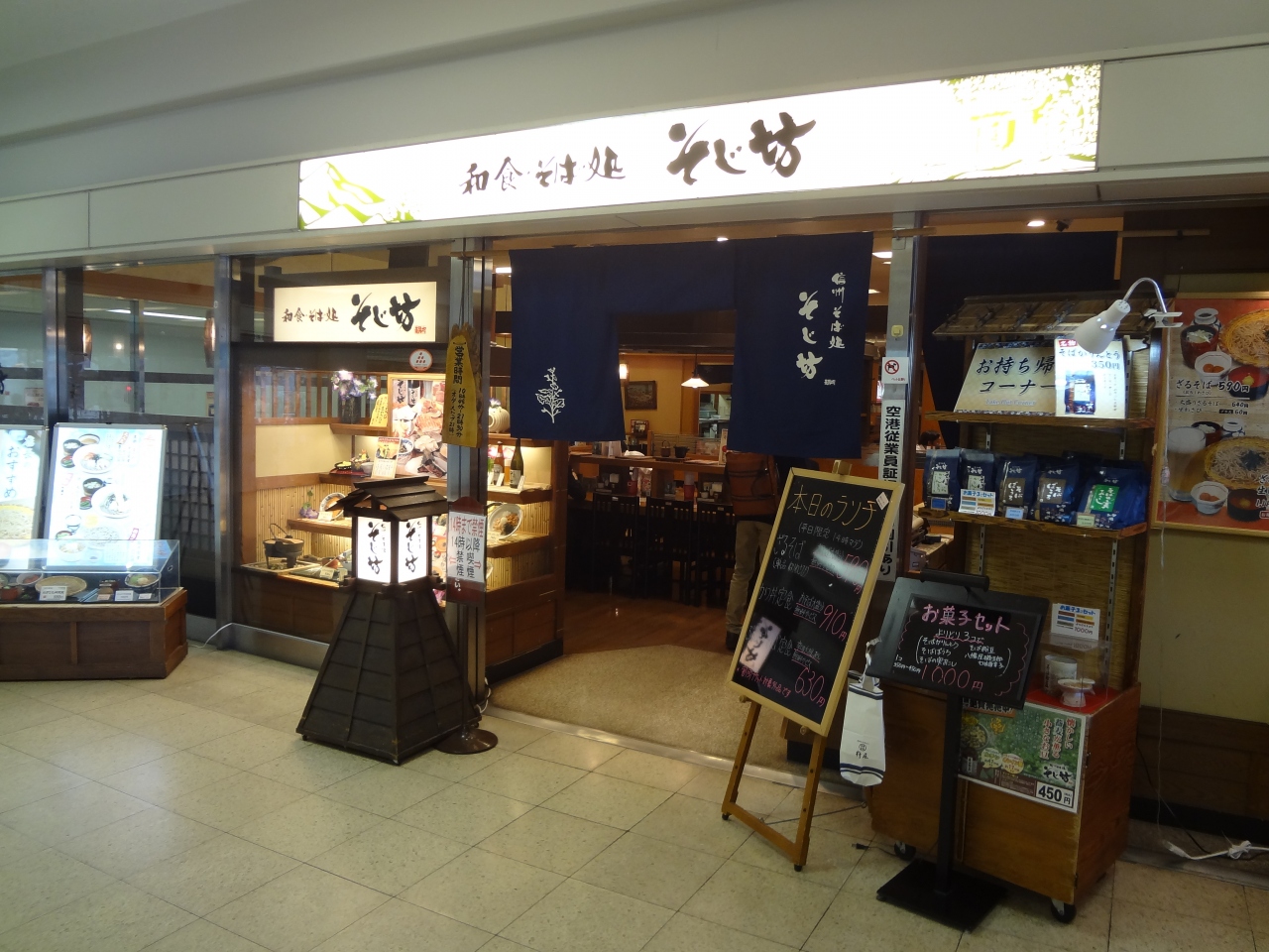 昼に到着したので空港でランチと思い、立ち寄ったのがこのお店です。場所は北ターミナル1階、JAL側の出口を出た左側です。14時までのランチで「ざるそば」が590円とお得な値段でしたので、それに惹かれて食べました。その他にもおそばが付いたカツ丼定食なんかもありました。こちらはボリュームありそうです。ざるそばは大盛り無料サービスだったので、私はこれで十分でした。