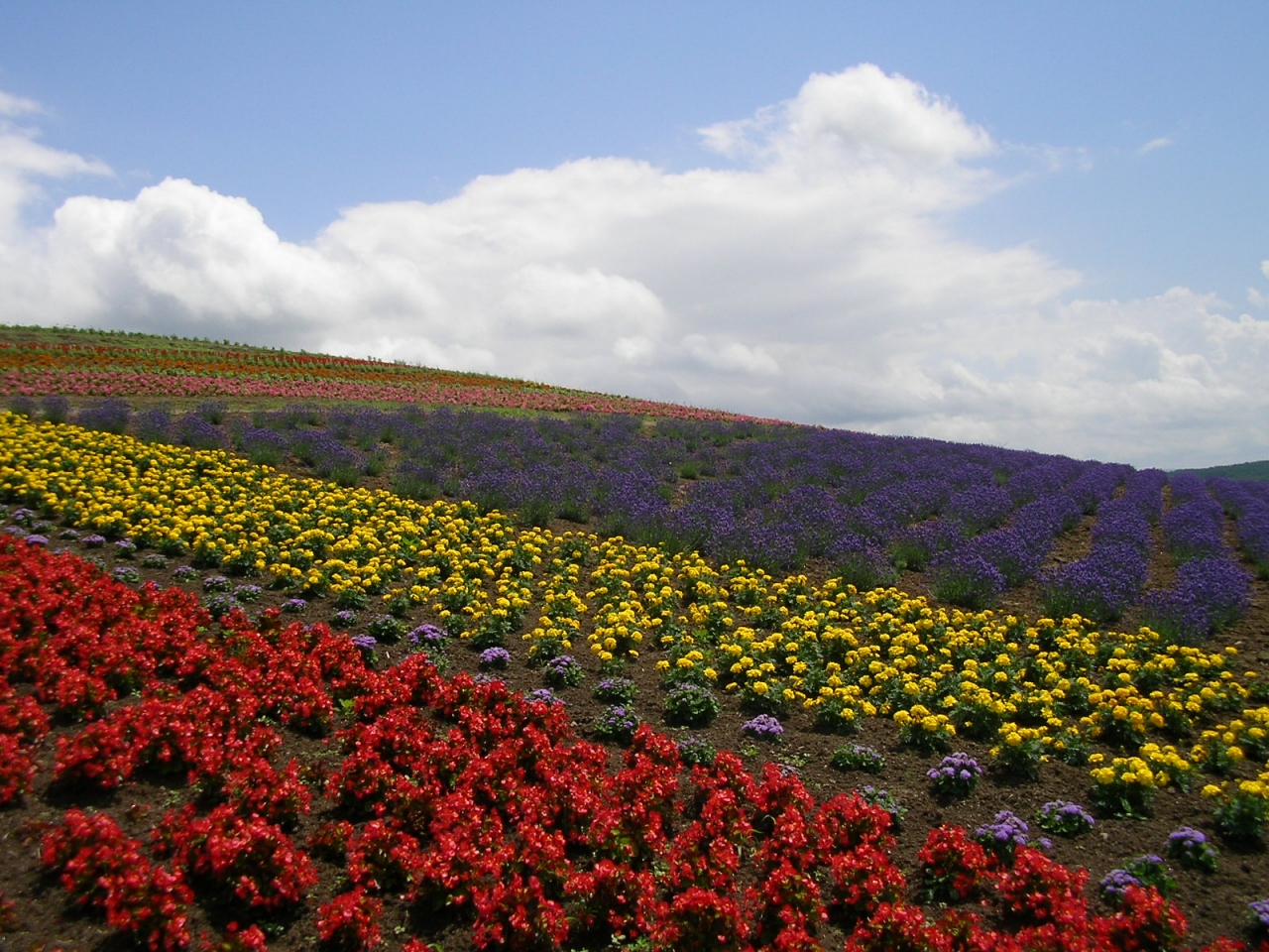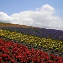 「日の出公園」は、JR上富良野の東に1km足らずのところにあります。ふもとの駐車場から展望台まではアスファルト舗装の遊歩道を歩くことになります。ラベンダーやルピナス、サルビヤなど沢山の花が咲いていました。展望台からは丘一面を紫に染めたラベンダーと広大な十勝岳連峰など360度の眺望を楽しむことが出来ました。上富良野駅からわりと近いので、車でない方にも便利かと思います。なお、この公園には、設備が整ったオートキャンプ場(有料)もあります。