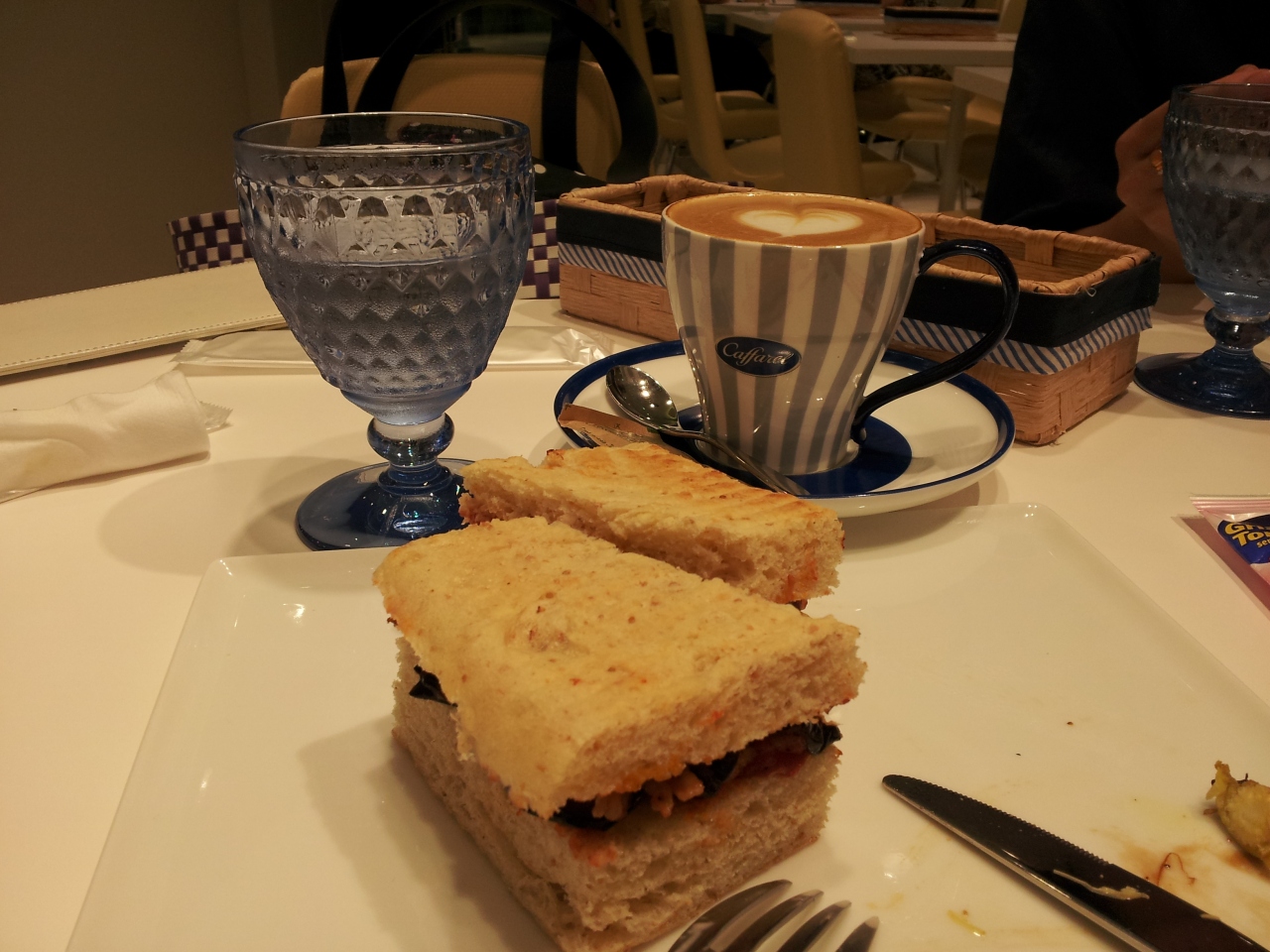 パニーニのランチは種類も5~6種類あり、昼食的なパニーニとおやつ的な甘いパニーニがありました。私たちは野菜や生ハムやいかにもそぎ切りにしたようなチーズがはさまったもので、野菜が特においしかったし、パンも素材にこだわってる感じがすごく伝わりました。パニーニのセットにはスティック状のクラッカーのようなものもついてきました。