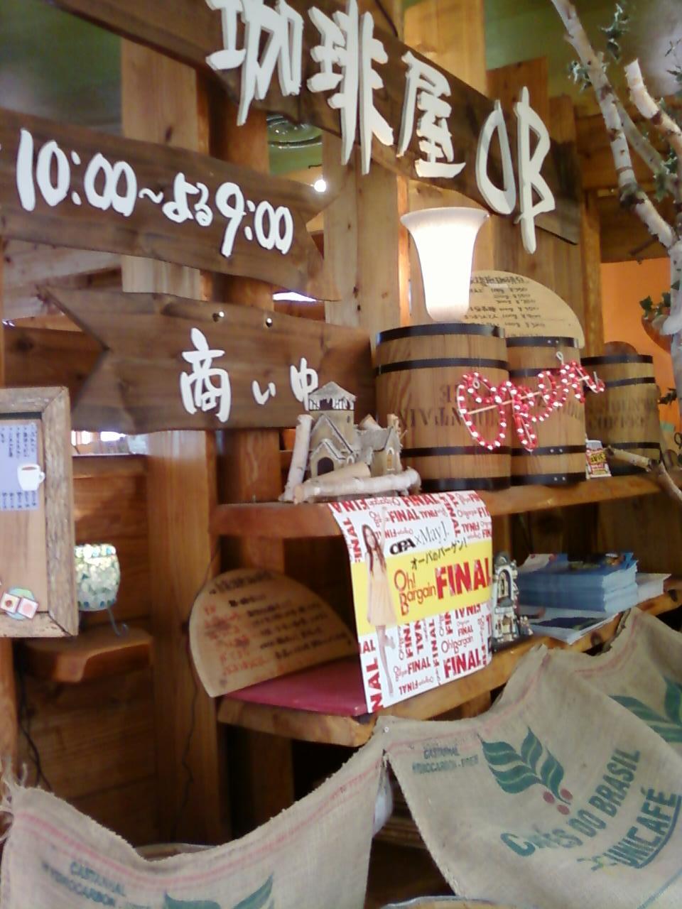 ここの珈琲屋OBは、小田急線の新百合ヶ丘駅南口から1分くらいのOPA、2階にあります。朝10時から夜21時まであいている喫茶店で、コーヒーの他に、ホットケーキ、パフェ、ピザ、サンドイッチなどもあります。まずびっくりするのがその内装です。まるで山のロッジに来たみたいな気分で、とってもすがすがしく、まるでハイキング気分でおいしいコーヒーをいただけます。この内装はOPAまで来たら必ず一度は見る価値はありますね。