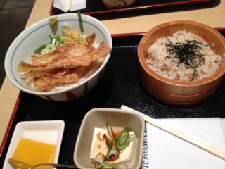 冷やしごぼ天うどんと鯛飯のセットを頼みました。セルフサ‐ビスシステムです。