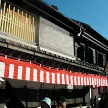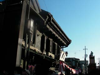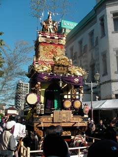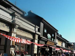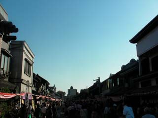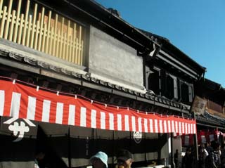 市役所前からメイン通りに行ってみると、普段は車道から蔵造りの町並みを見ることは出来ませんが、川越まつりの間は、通りの真ん中から両側に広がる町並みが見られます。夕日に照らされて黒光りする蔵の前を山車が通っていきました。