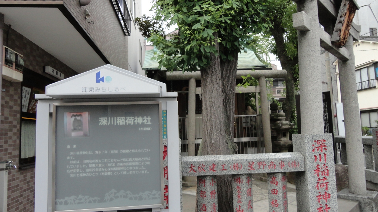 清洲橋通りから北に2本、西深川橋と万年橋のちょうど中間のところにあります。1630年に創立された歴史ある神社です。それほど大きな神社ではありませんが、深川七福神の一つ、福福しい、布袋尊が祀られています。