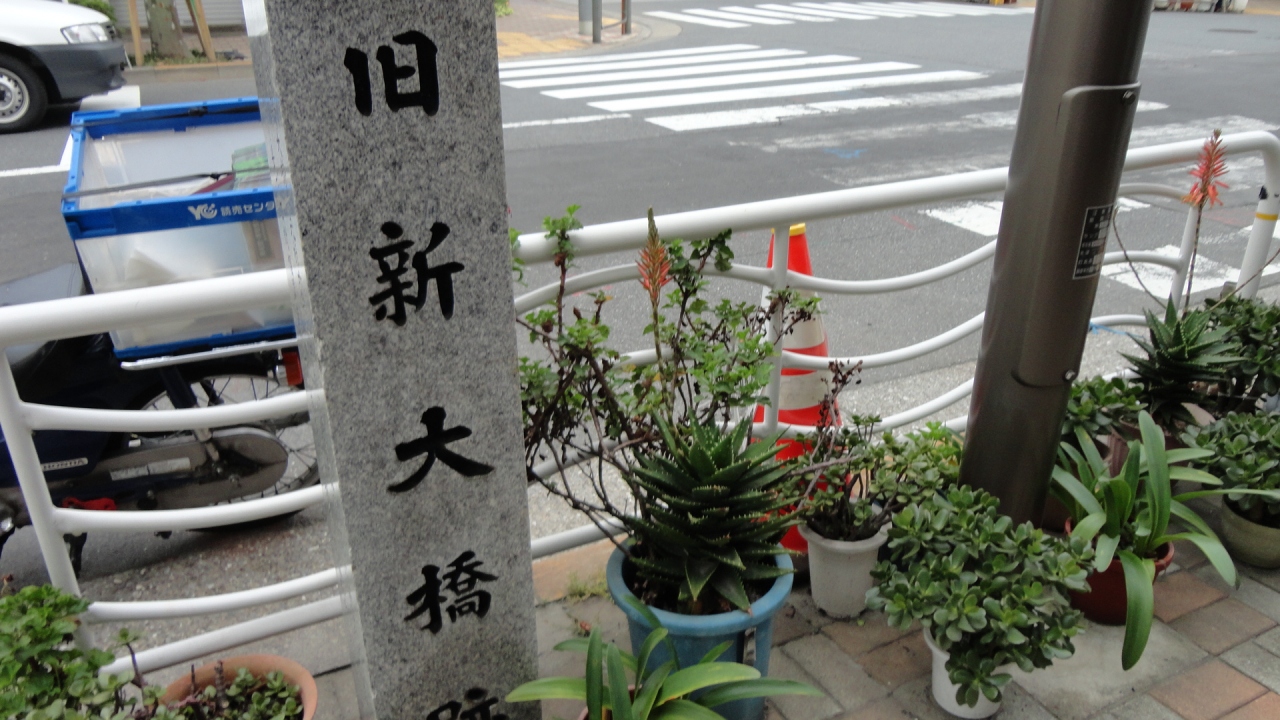 万年橋と芭蕉記念館の間に、この石柱があります。歩道の端に建てられており、気づかずに通り過ぎてしまいそうです。新大橋は5代将軍綱吉が建てたものだそうです。隅田川に架かる橋は当時、両国橋と千住大橋しかなかったそうで、新大橋は交通の重要な役割を果たす事になる木橋だったそうです。