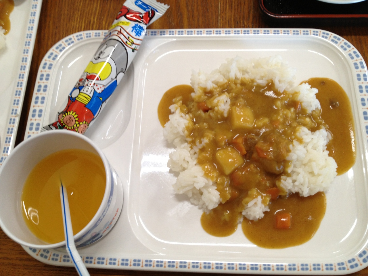 甘口カレーライスにジュースとうまい棒がついてきます。