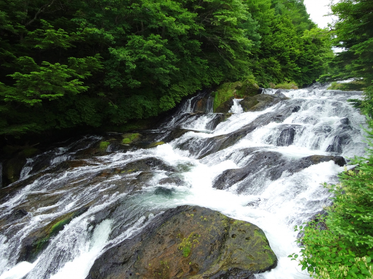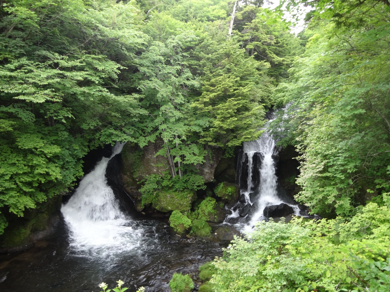華厳ノ滝がどーんと一気に落ちる滝なのに対して、こちらは階段状の溶岩の上を流れ落ちる滝です。滝壺あたりはちょろりと分岐して、これが龍のヒゲで「龍頭之滝」だそうです。