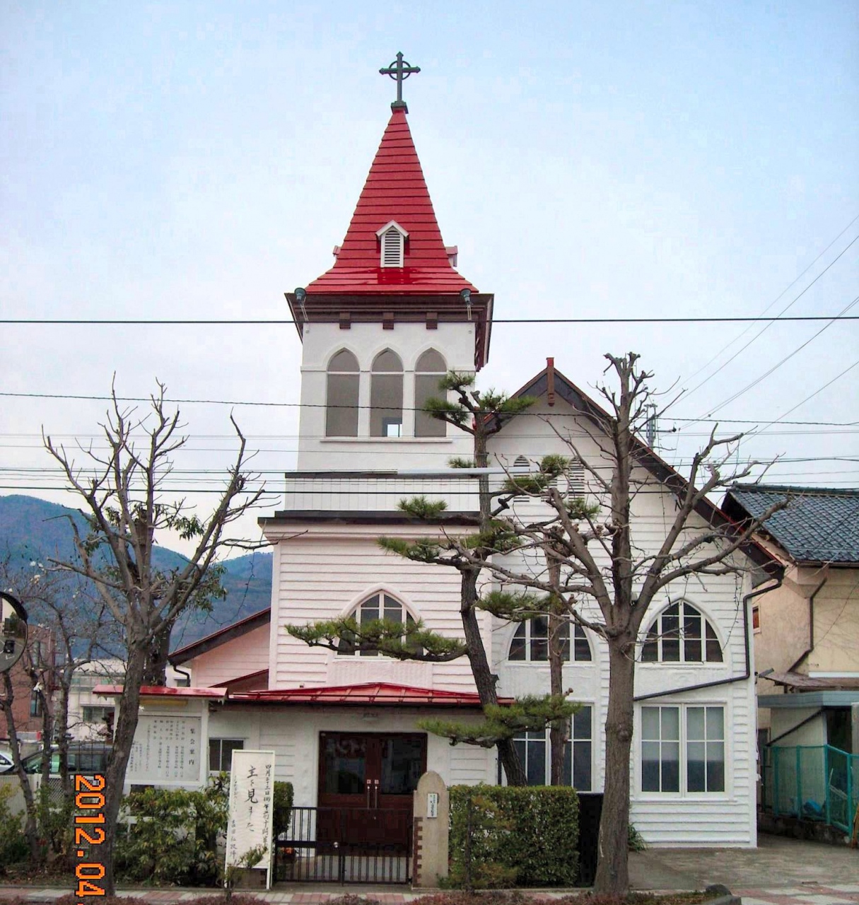 三角に尖った赤い屋根に十字架,外壁は白といった如何にも教会らしい建物です。