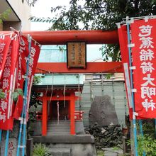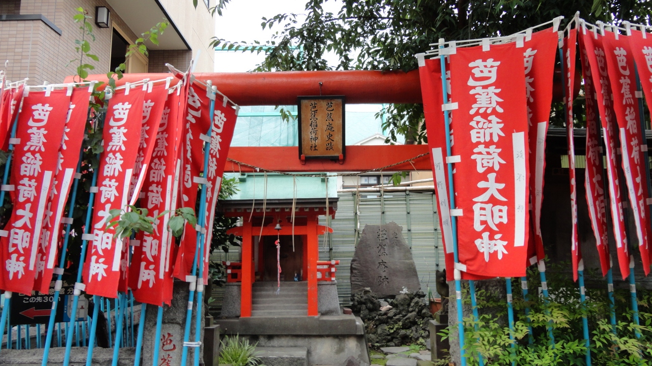 萬年橋を北側に渡ると、案内板がありますのでそれに従って西に曲がると、稲荷神社があります。ここが芭蕉ゆかりの神社です。大正6年の津波来襲の後、芭蕉が愛好したといわれる石造の蛙が発見されたため、ここに創建されたそうです。