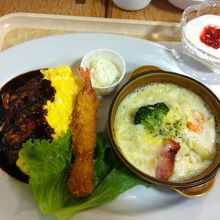 オムライス絡みのメニューがやたら多い気がしますが、僕が頼んだのもデミグラスソースのオムライスとミニグラタンのセットでした。オムライスは看板商品だけあってふわっとした舌触り。普通に美味しいです。これにデザートのヨーグルトが付きます。