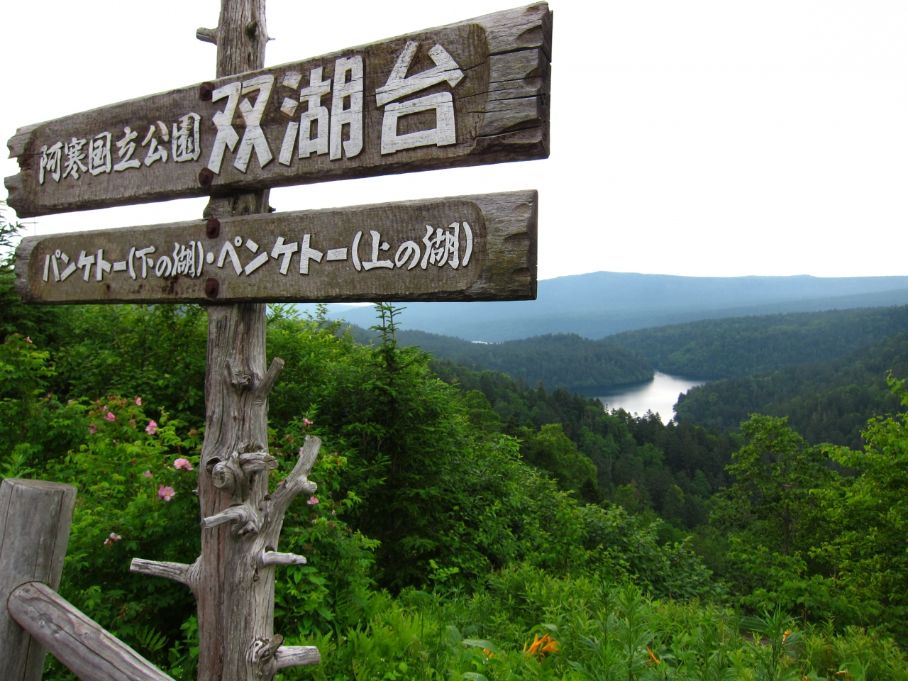 阿寒湖から弟子屈に抜ける阿寒横断道路(国道241号線)の右手に双湖台の駐車場があります。駐車場から少し登った売店の前が双湖台になっていて、ここからパンケトー・ペンケトーを望むことが出来ます。上部にかすかに見えるのがパンケトー、手前に見えるのがペンケトーです。