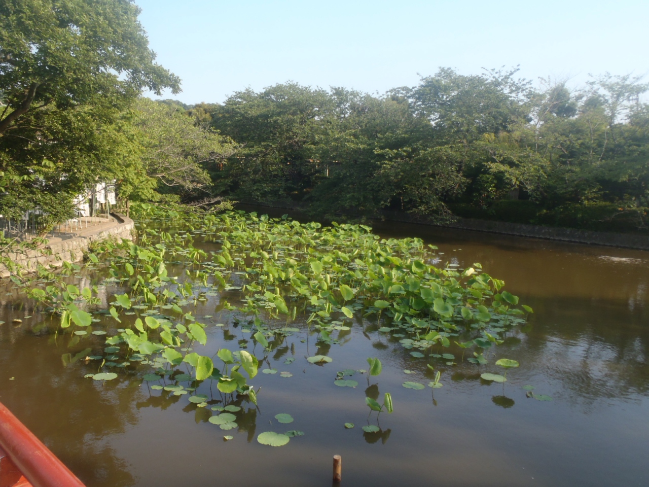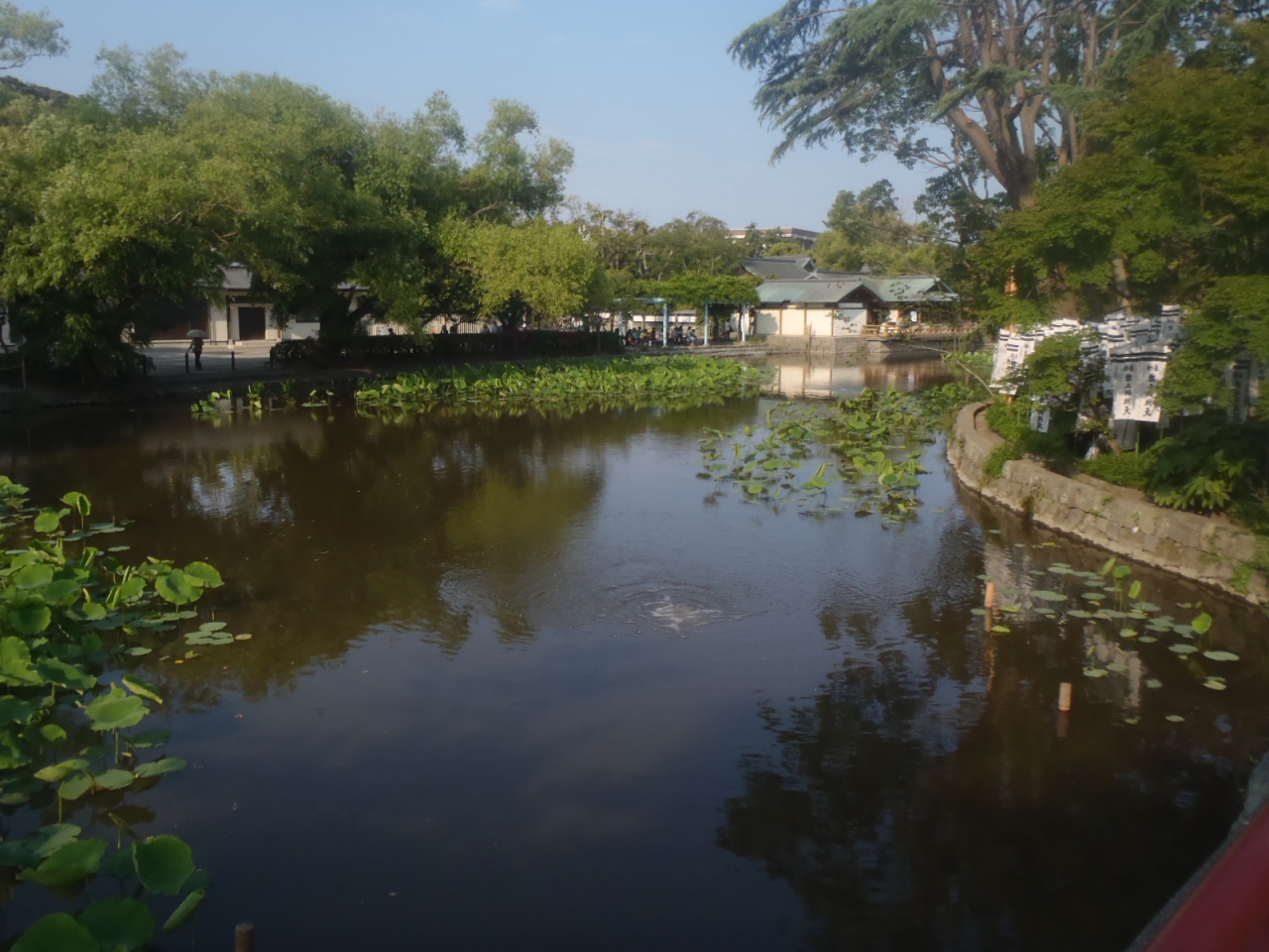 頼朝の妻の政子が源家が栄えることを願ってこの池を造らさせ、東の池には白い蓮、西の池には赤い蓮を植えさせて、源平の旗の色を表わしたと伝えられており、それで源平池という名前が付いているということです。
