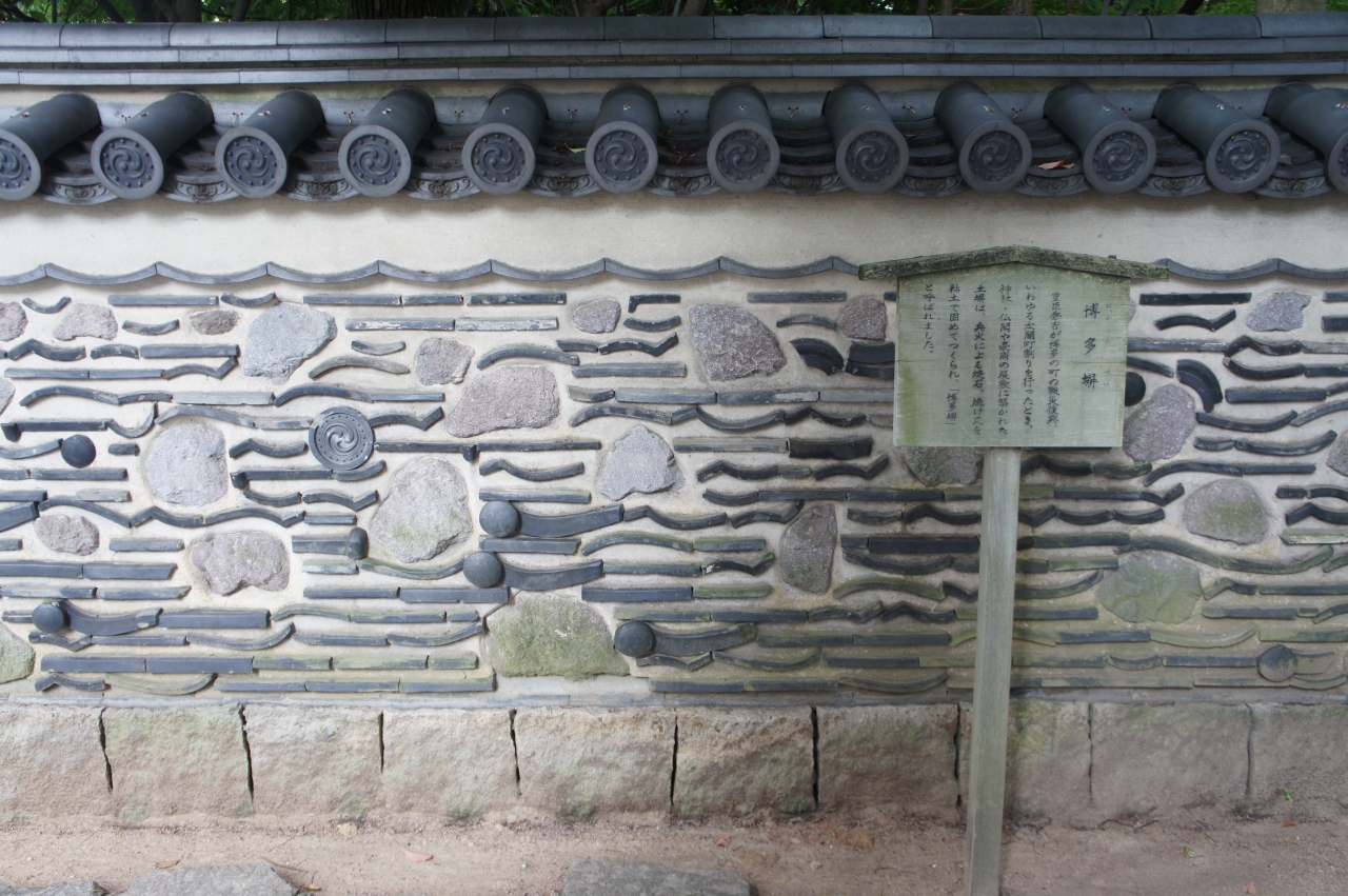 楽水園は、明治の後期、博多商人、下澤善右衛門親正が住吉別荘を建てた跡地です。現在の庭園は、福岡市が池泉回遊式の日本庭園として整備したもので、古いものではありません。周囲を囲む塀は、博多塀。豊臣秀吉が博多の町の戦災復興にあたり、兵火による焼石、焼け瓦を粘土で固めたもので、面白い意匠となっています。