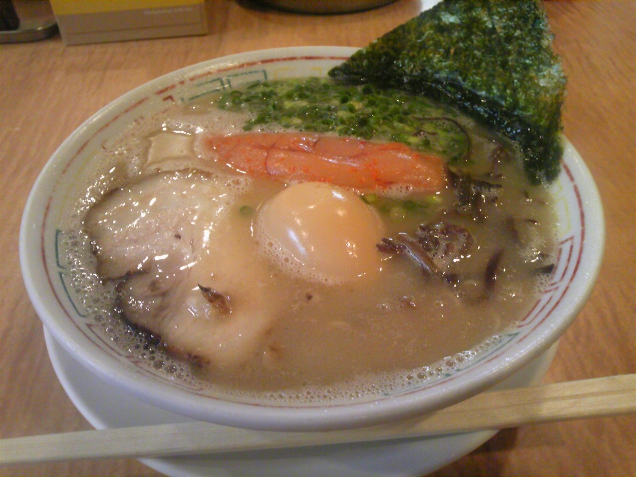 とんこつラーメンのお店です。九州とんこつといえば、あっさりな博多やこってりな熊本というイメージがありますが、大牟田ラーメンって??白と黒があり、白にしました。極細麺に濃厚な褐色寄りの白濁とんこつスープでした。味濃いめです。九州だし…と思い明太子をトッピングしてみました。丸ごと一本です。うーん、これは白米が必要になりますね。