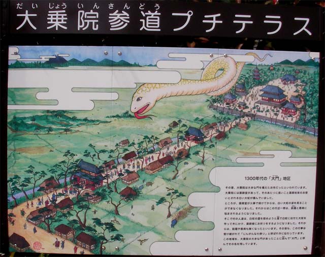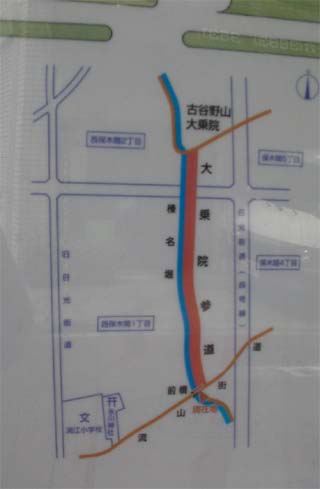 宝積院から住宅地を進むと大乗院参道プリテラスの看板があり、大乗院に向かって川沿いに参道が延びているのが分かります。現在は住宅地ですが、昔は田圃の中を参道が延びていたようです。道路を越えた先にある大乗院は、工事中で境内には入れませんでした。