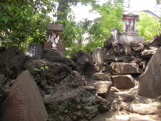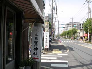 小右衛門稲荷神社から旧日光街道に戻り北に進むと鷲神社の入口の看板があり、すぐに島根鷲神社に着きました。広い境内にある千木の乗った拝殿の横に2メートルほどの富士塚があり、溶岩を模したボク石もあり、山頂には木花開耶姫の石碑がありました。