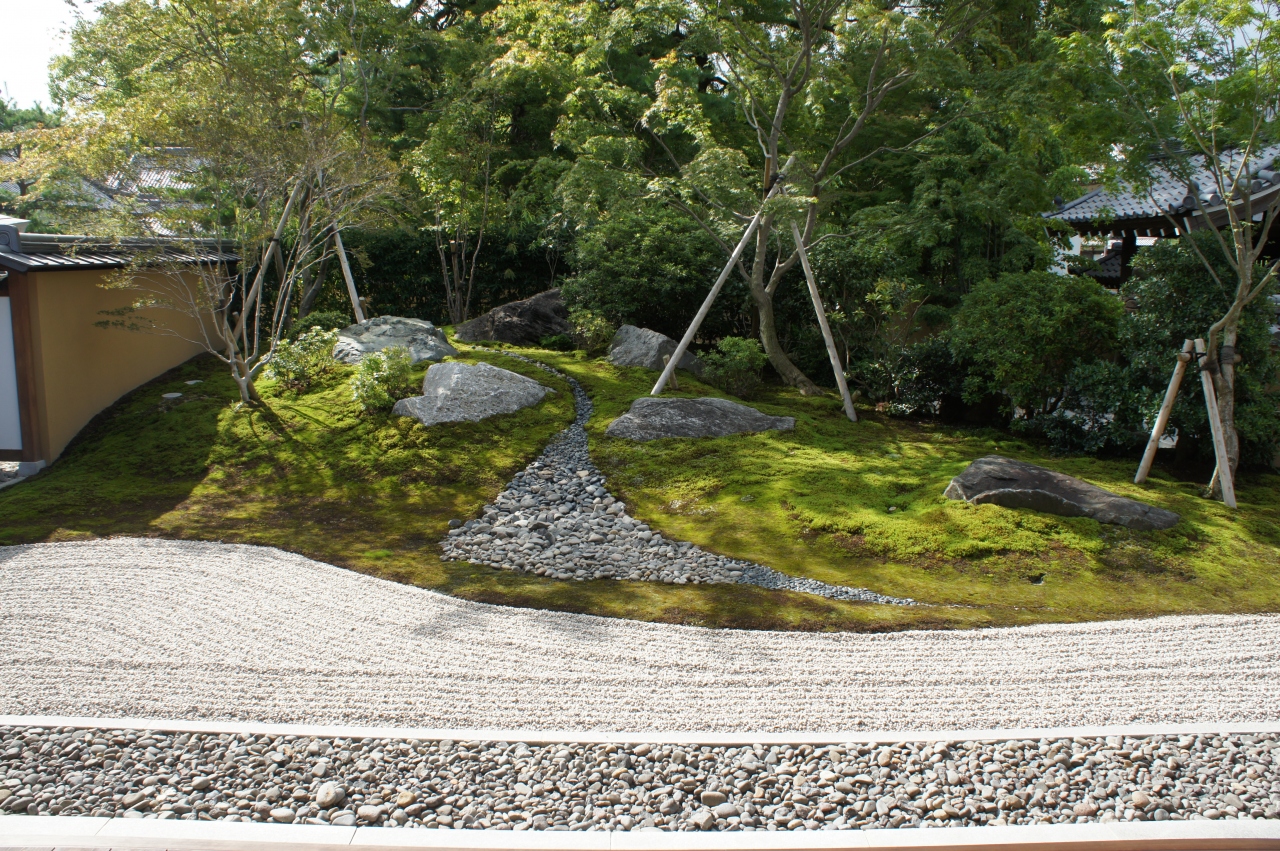 天與庵は、承天寺の北隣り。承天寺の塔頭寺院です。入口を入ると、奥の方丈へ続く道。見ると方丈の前に見事な枯山水庭園がありました。うれしいことに、誰もいない方丈にはそのままあがれて、じっくりと鑑賞することができました。山から大海に流れ出る川を苔の築山と小石で表現。単純な作りではありますが、すっきりりしていてとても美しいです。