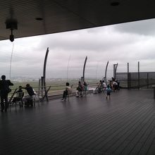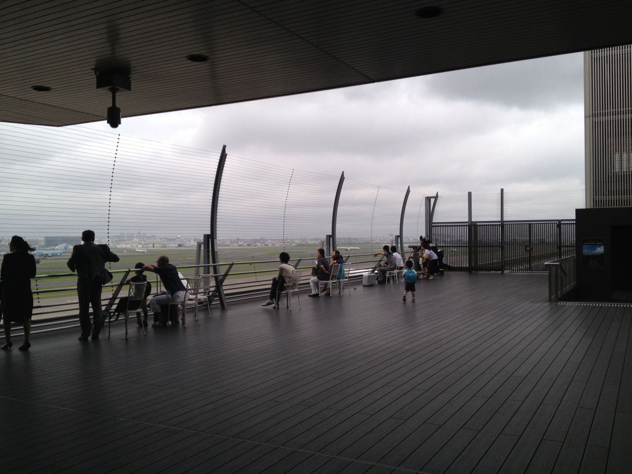 搭乗まで時間があったので展望デッキに行きました。目の前にA滑走路があり、ゴォーっという音とともに、次々と飛行機が離陸していきます。その迫力に子供たちは釘付け・笑