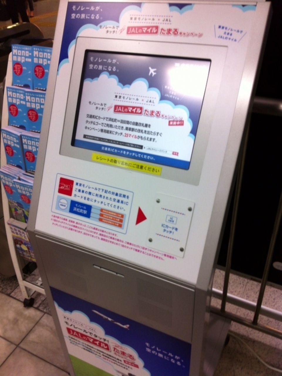 浜松町からSuicaで羽田空港まで行きました。改札を出るとすぐ脇に機械があり、よくよく眺めてみるとJALのマイルプレゼントという文言を発見!どうやら、空港~浜松町間を電子マネーで乗り、機械にタッチするともれなく25マイルもらえるようです。