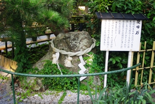 これは高槻城主の老臣であった長田丈八郎という者が、この神社に参拝したときにこの奇岩に目をつけ、城下の自宅の庭に持ち帰ったところ、「あまへいのう~ (安満へ帰ろう)」と啼いたため、霊石であるとしてまた神社に帰した、という言い伝えがある岩であるのだ。
