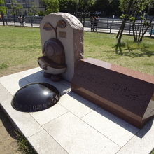 この手の記念碑にしてはとてもPOPです。それは、開港博のマスコット「たねまる」が刻まれているからです。親子の多い場所という事もあるのかもしれませんが、見ていて楽しいモニュメントです。