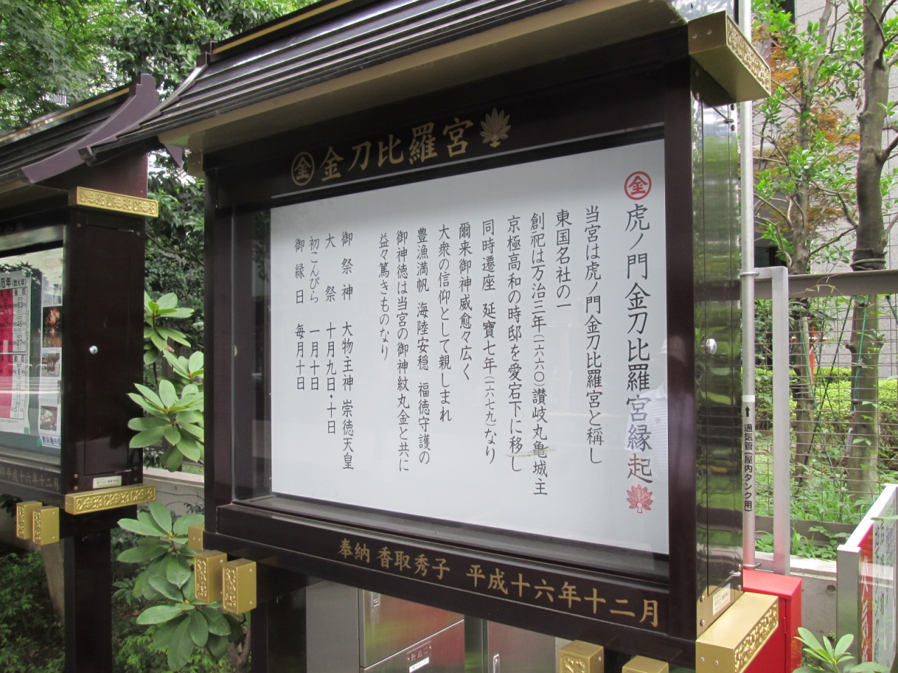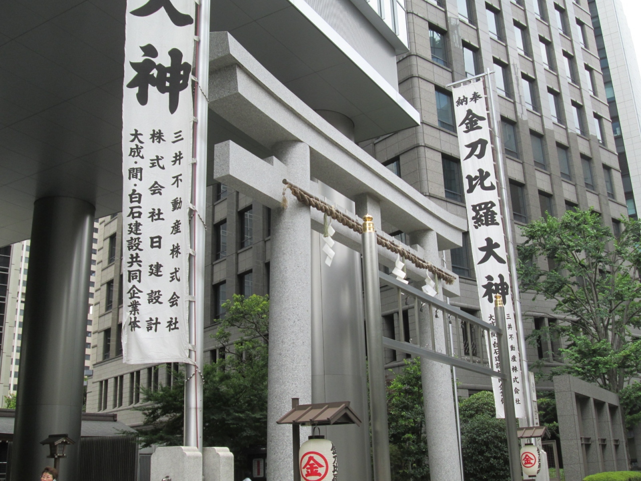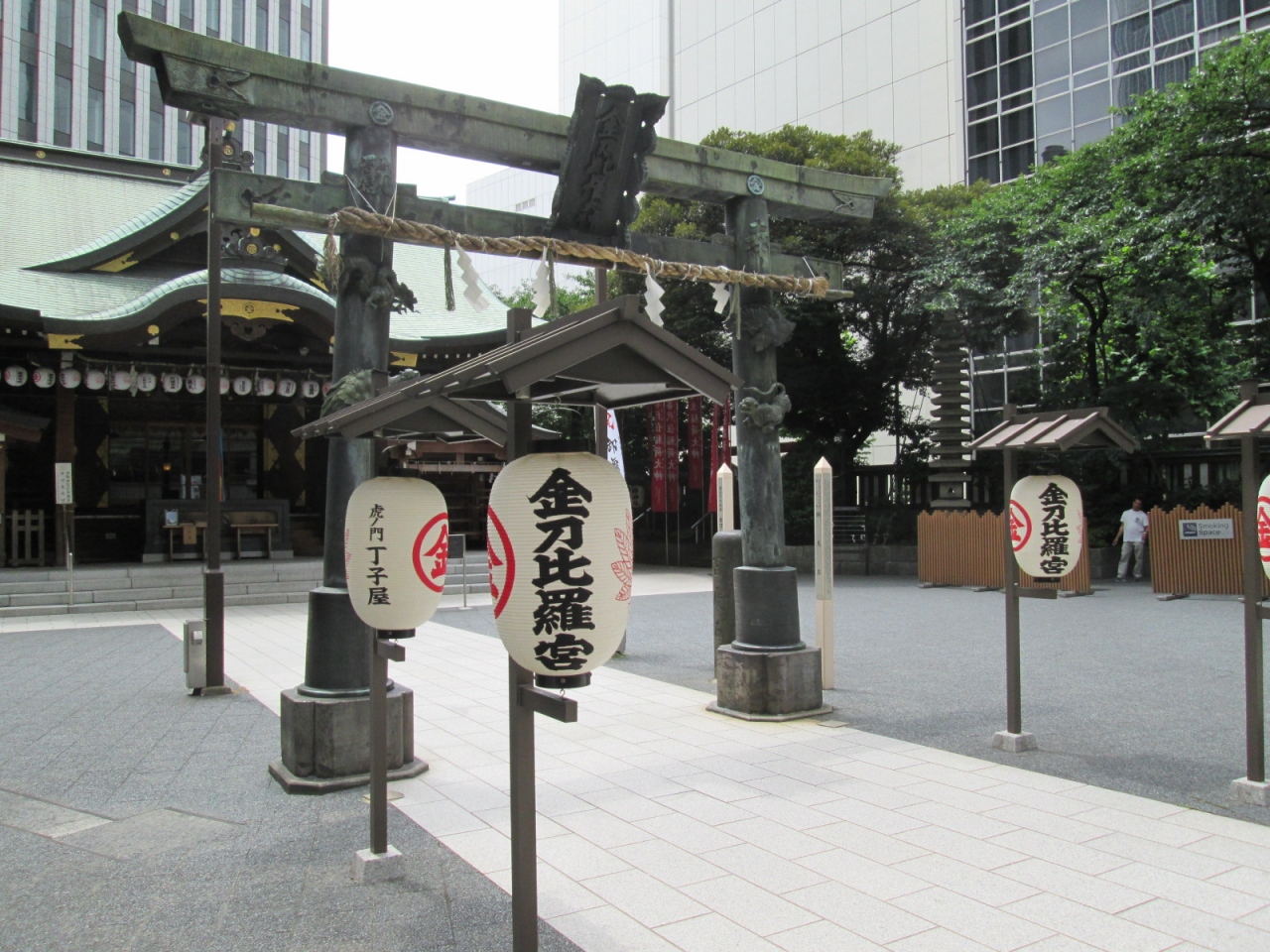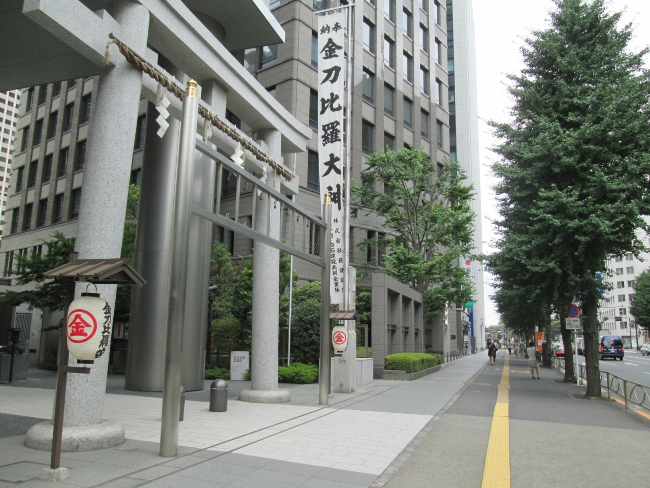 虎ノ門交差点から桜田通りをフラフラしていたら、通り沿いにある琴平タワーという大きな近代的ビルに、金刀比羅宮の幟(のぼり)と鳥居があるのを偶然見つけました。鳥居の下の参道を行くと、大きくはありませんが趣きのある社殿、そして神楽殿までありました。紹介文には「1679年に金刀比羅宮(本宮)の御分霊を現在の虎ノ門に遷座」とあり、長い歴史があることに驚きました。また、祀られている中には崇徳上皇もおられるということ、ちょっと怖い気もしました。