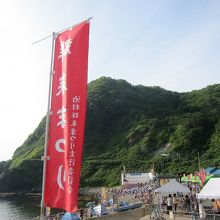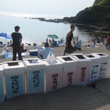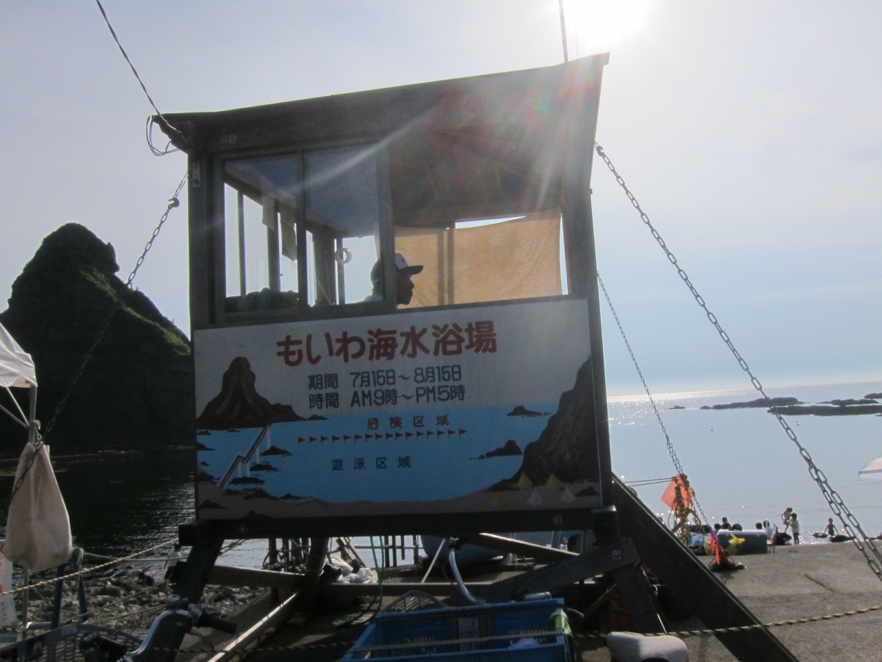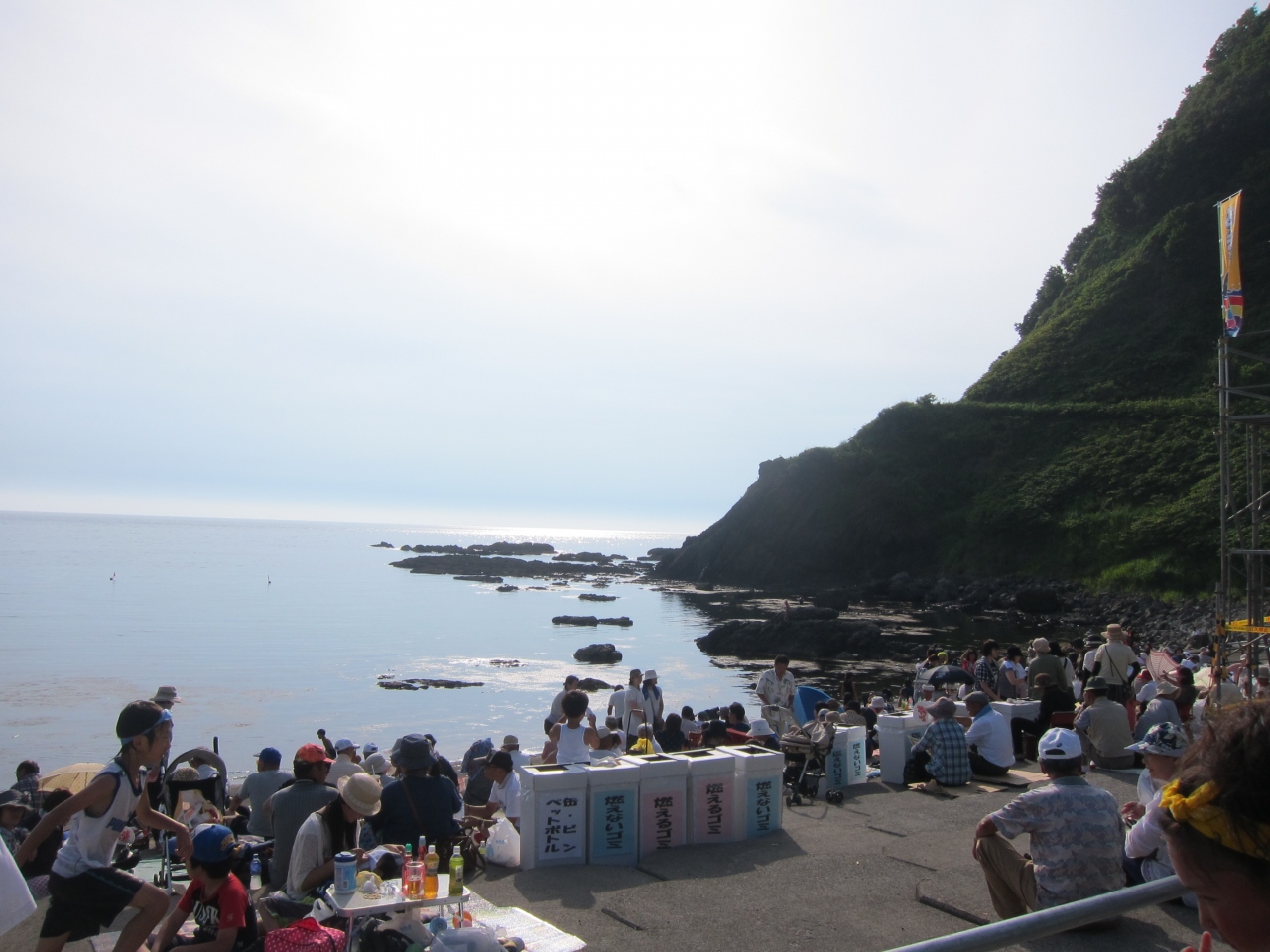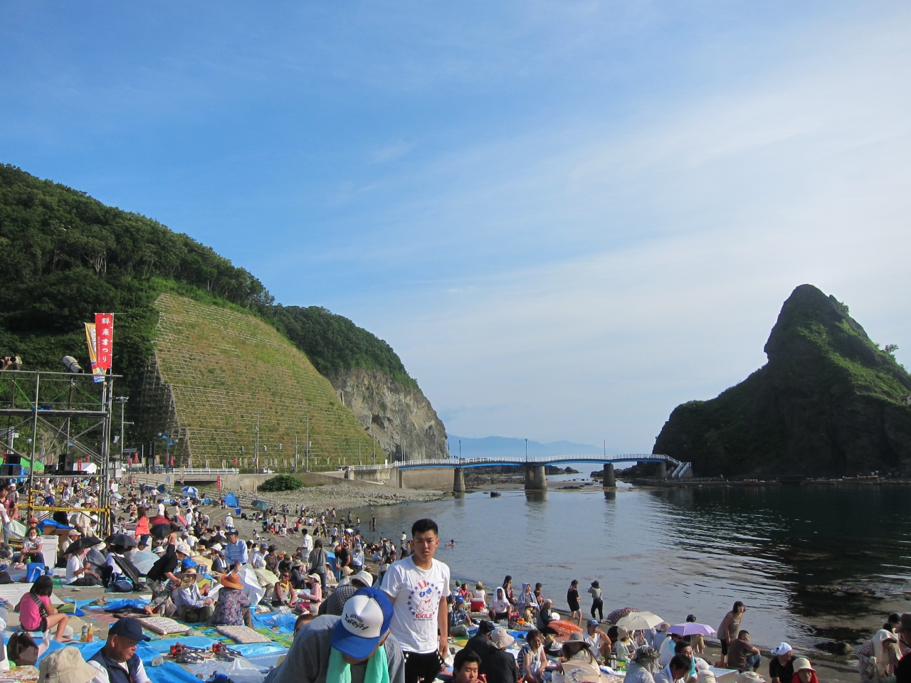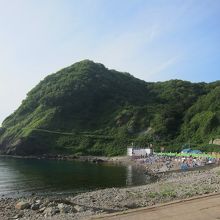 積丹半島の西側、泊村の神恵内村との境目付近にあります。海岸沿いを走る国道229号線が目の前を通っています。奇岩が続く積丹半島の西側にいくつかある入り江の一つで、盃温泉郷やキャンプ場などがあります。岩場の海岸で(足を切りそうな岩が並ぶ磯ではなく、石がごろごろしている感じ)、湾口の内側、波打ち際から40~50m沖に遊泳区域を示すブイが浮かんでいます。積丹の青い海が続き、水がエメラルドグリーンに光っていました。また、目の前に弁天島が浮かび、歩道橋で渡ることができます。監視所の看板に7月15日~8月15日、午前9時から午後5時までの時間と遊泳区域を示す表示がありました。石がごろごろする海岸にはコンクリートの段々の護岸も整備され、パラソルを広げ、座ったりするのに便利です。海水浴場は毎年7月に行われる泊村の群来祭りの会場にもなり、歌謡ショー、花火大会などの各種催し物のほか、屋台が並び大勢の人で賑わいます。