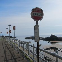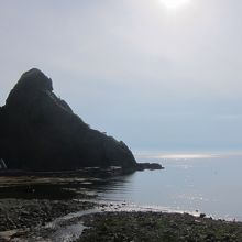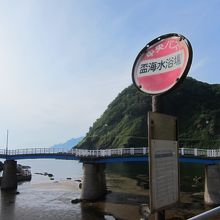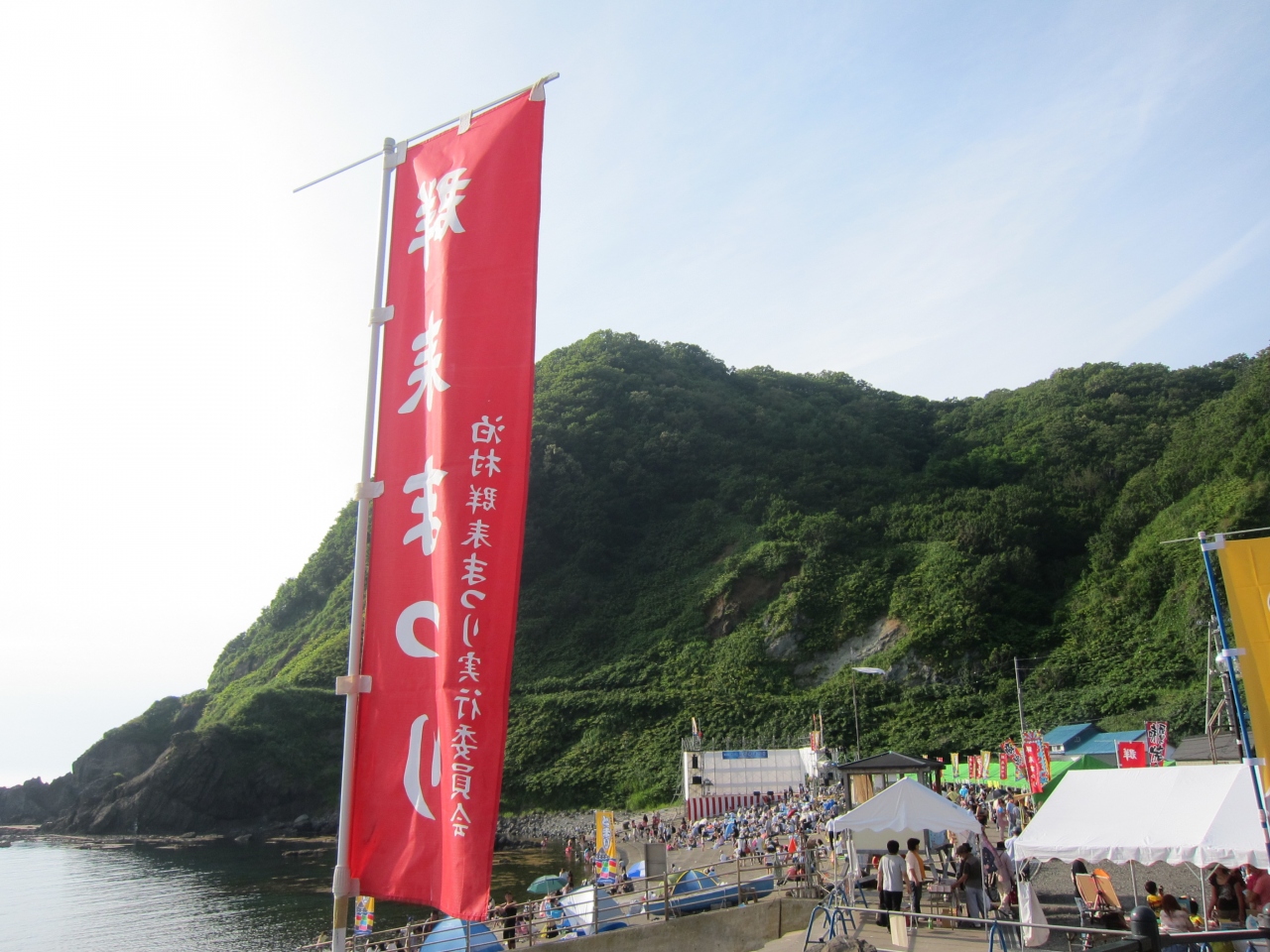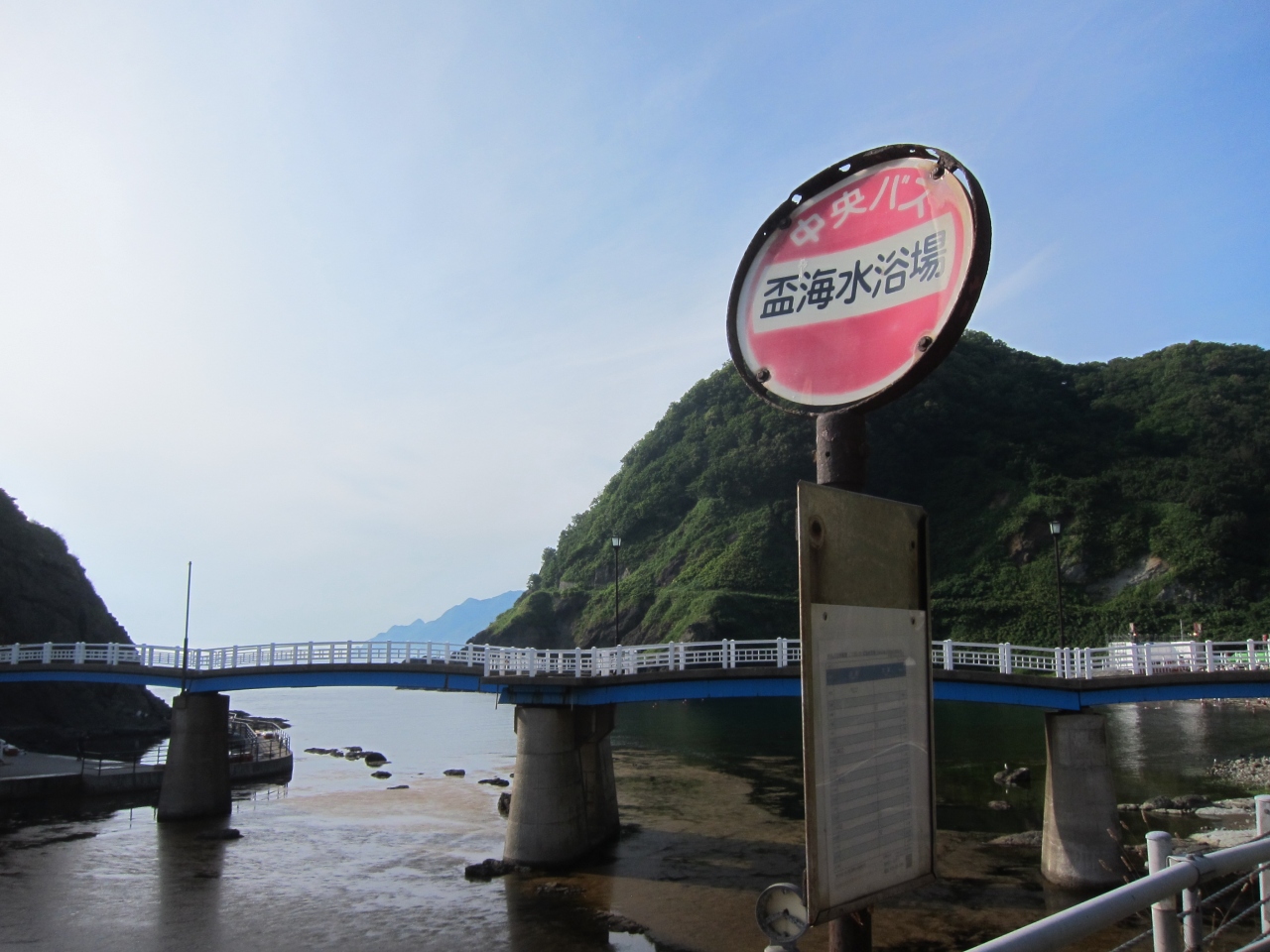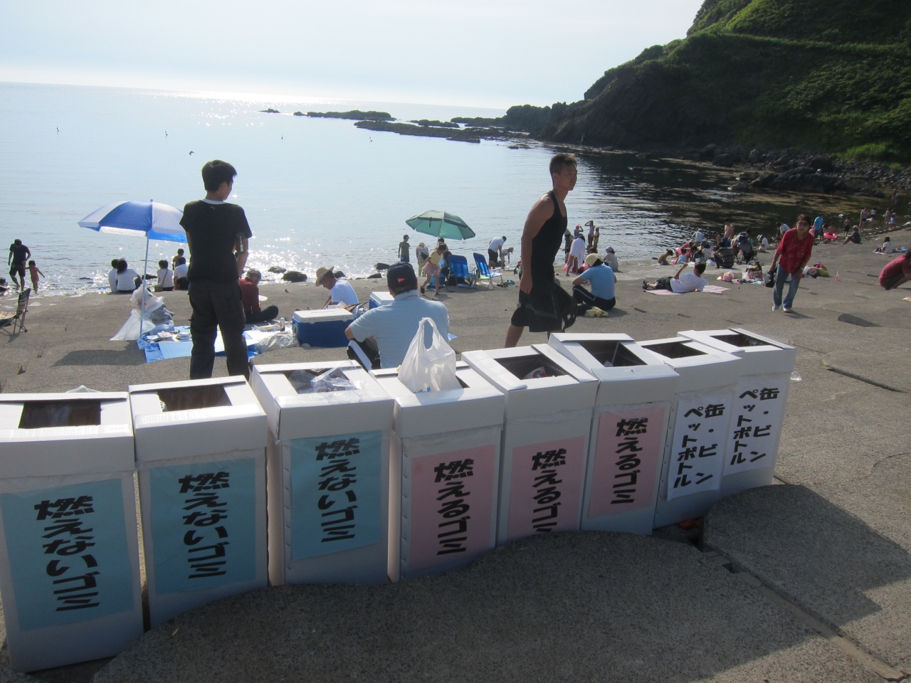積丹半島の西側、泊村の神恵内村との境目付近にあります。海岸沿いを走る国道229号線が目の前を通っています。奇岩が続く積丹半島の西側にいくつかある入り江の一つで、盃温泉郷やキャンプ場などがあります。岩場の海岸で(足を切りそうな岩が並ぶ磯ではなく、石がごろごろしている感じ)、湾口の内側、波打ち際から40~50m沖に遊泳区域を示すブイが浮かんでいます。積丹の青い海が続き、水がエメラルドグリーンに光っていました。また、目の前に弁天島が浮かび、歩道橋で渡ることができます。監視所の看板に7月15日~8月15日、午前9時から午後5時までの時間と遊泳区域を示す表示がありました。石がごろごろする海岸にはコンクリートの段々の護岸も整備され、パラソルを広げ、座ったりするのに便利です。海水浴場は毎年7月に行われる泊村の群来祭りの会場にもなり、歌謡ショー、花火大会などの各種催し物のほか、屋台が並び大勢の人で賑わいます。