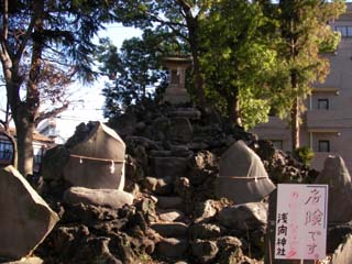 冨士浅間神社の裏側に広場があり、地元の人が忘年会をやっています。さらに進むと鳥居の先に富士塚があり、高さ3メートルほどで、丸瀧講の講紋の入った登山記念碑が並んでいます。「危険です登らないで」の看板があるので、周囲から見るだけにしました。