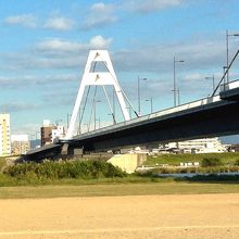 豊里大橋は、斜張橋の構造で。万国博覧会が開催された昭和45年3月に 開通それまでは橋 の右側に「平田の渡し」があった。休日は家族連れのバーベキューが盛んで以外に穴場のBBQの場所です。水道も完備されているので手近なBBQが楽しめます。