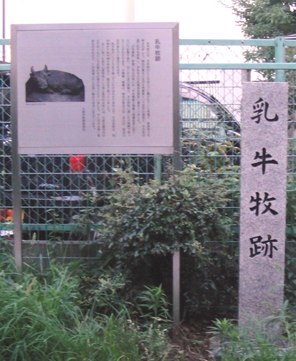 古代律令制時代以来、典薬寮:朝廷で医薬を取り扱っていた官省)に所属していた牛牧「味原牧」がありました。「味原牧」は、摂津市の味原の地から淀川が分流する江口の下流部(現在の南江口・大桐・大道南あたり)に分布していたといわれ、乳牛を飼育していたことから「乳牛牧」と呼ばれていたそうです。