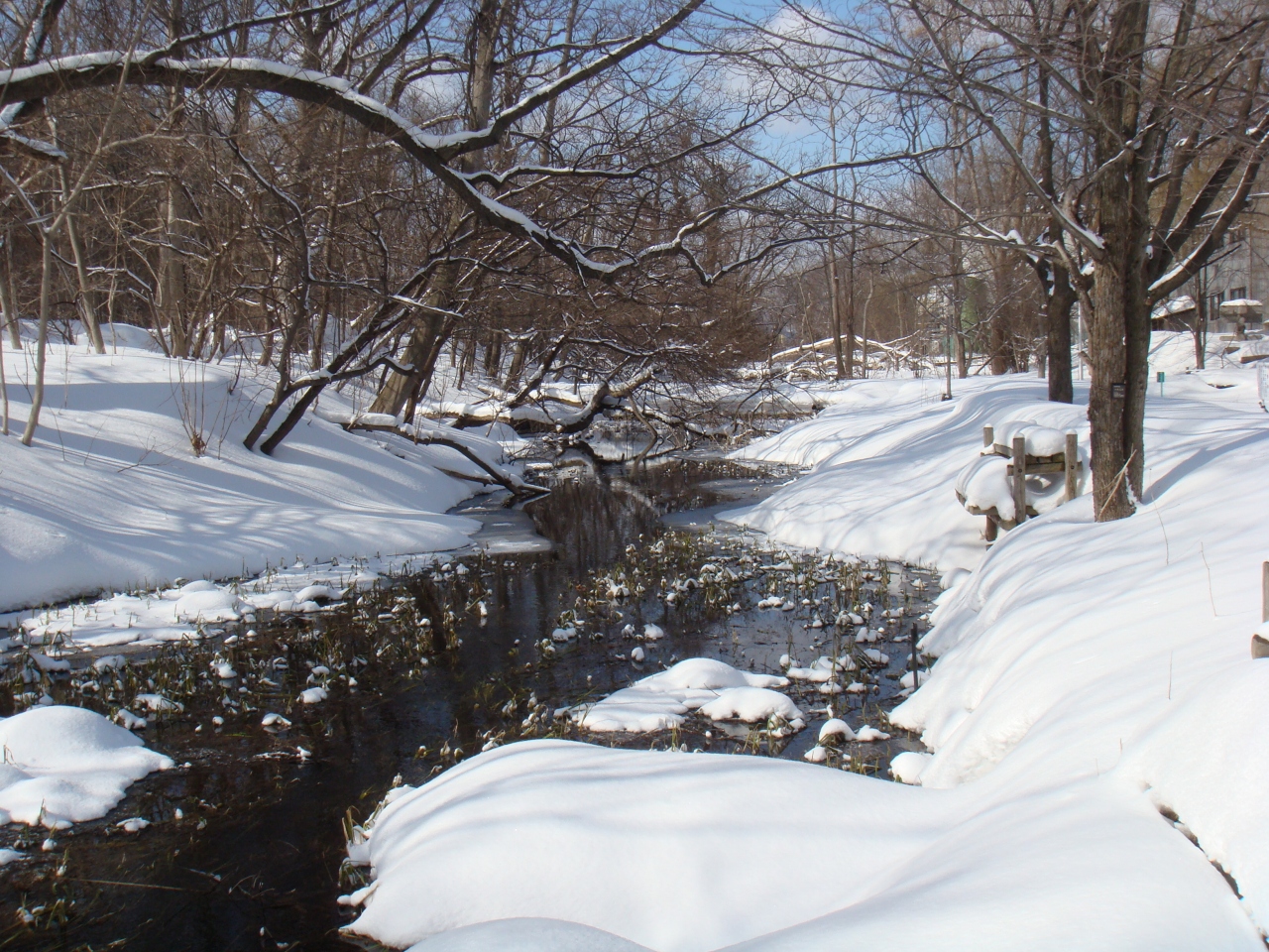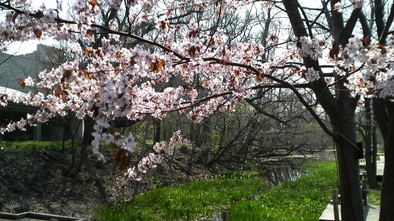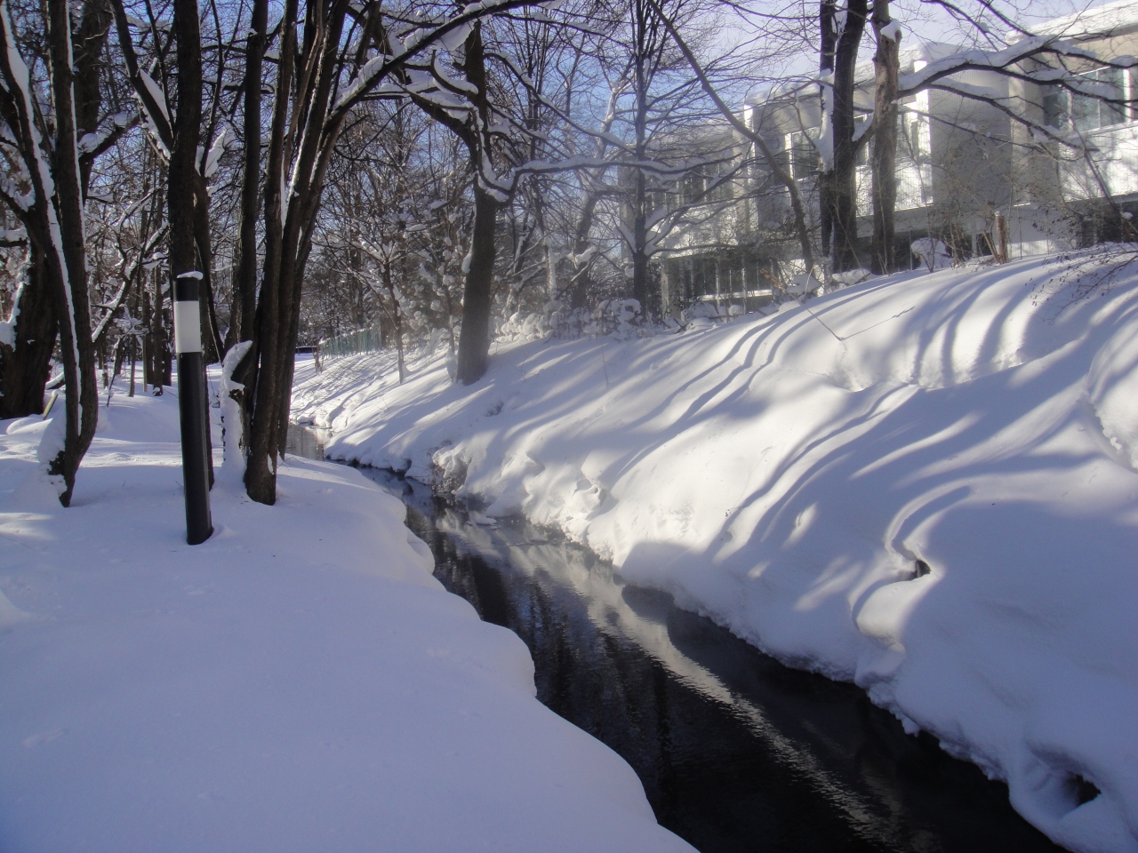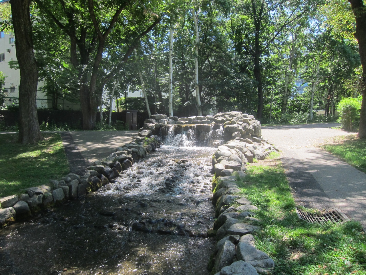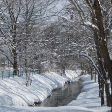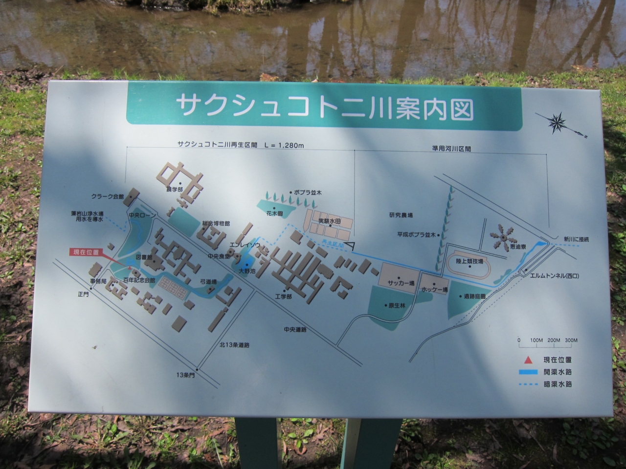 北海道大学内を南から北へ流れる小川です。川の周囲は遊歩道や草地、樹木が整備され、大学の中にあって、庭園風の点景を与えてくれます。普通、大学の中を流れる川といえば用水路や、排水が流れ込んで汚れた川という印象を持つかもしれませんが、この小川は札幌市の藻岩浄水場から引かれた澄んだきれいな水です。大学の正門から構内へ進んでいくと整備された庭園風の広場の草地があります。木々が木陰を作る中、緑のじゅうたんに一筋のせせらぎが時々、光を反射しながら蛇行するのが見えます。深さも足の甲が隠れる程度。砂利が敷いてあるので足が汚れず中に入れるので、小さな子供たちがはしゃぎ回っていました。川はこの後、北上し大学の真ん中あたりまで流れていきます。このあたりは川の横を遊歩道が整備されています。メインストリートをくぐり、大野池という整備された池の横を通過します。だいたい良いのはここまでで、その後、北18条のあたりで新川(琴似川、琴似発寒川)に注ぎます。冬は雪深く、遊歩道を歩くのが困難だと思いますが、ときどきカルガモもやってくる四季折々の表情が味わえます。