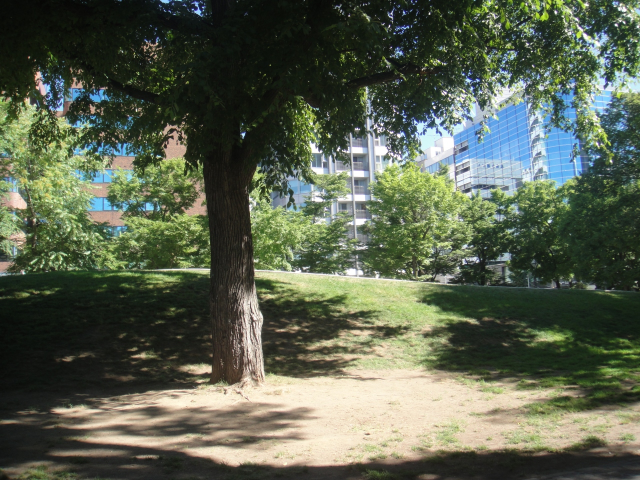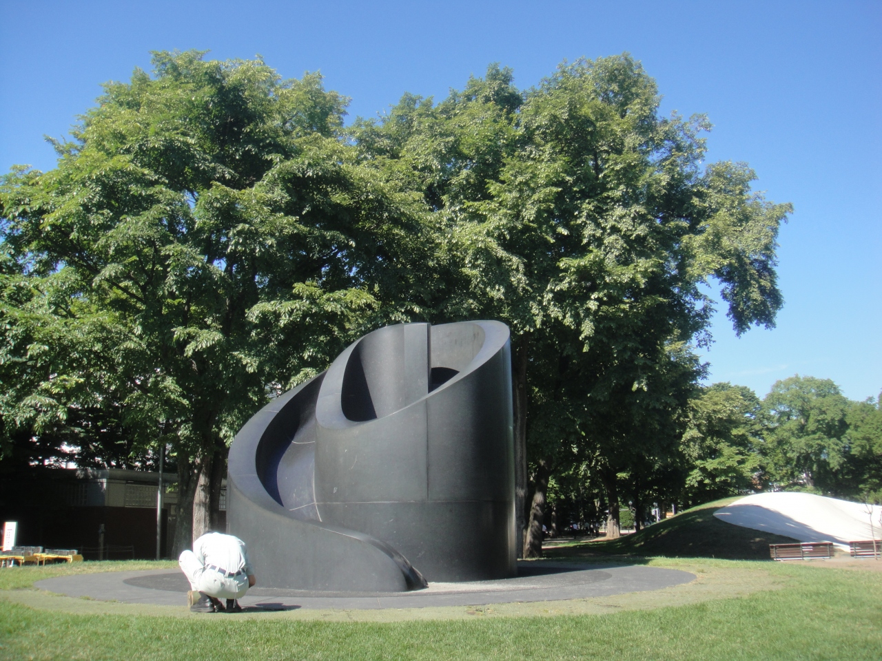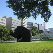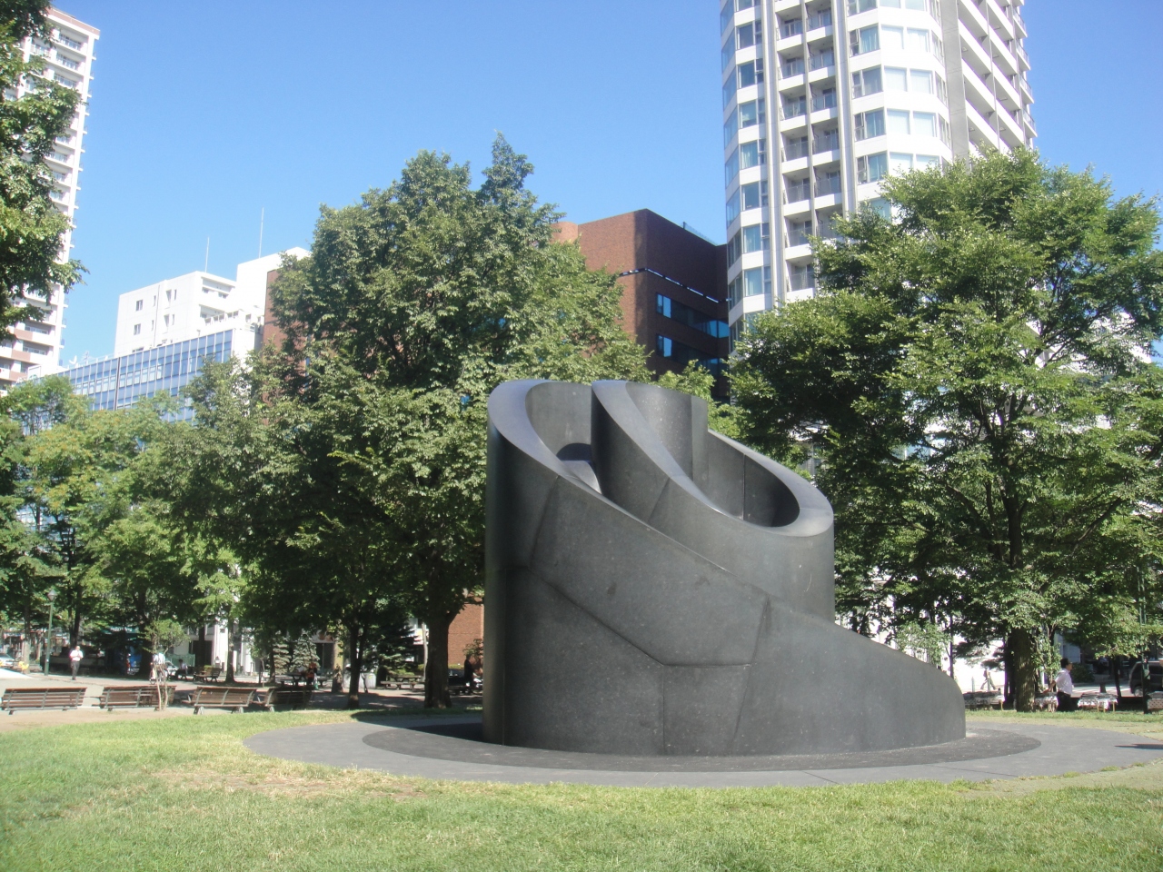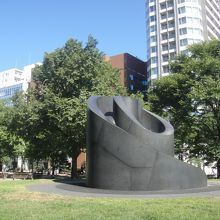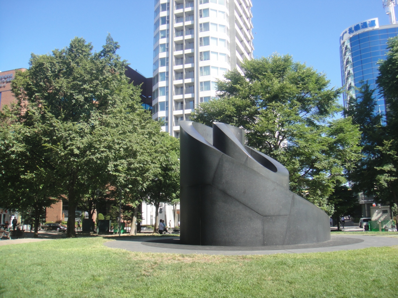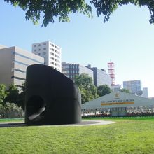 大通公園の西8丁目にあるモニュメントです。すべり台になっていて、休日などは子供たちの遊び場になっています。付近には別のすべり台など、他の遊具や築山があり、大通公園内でのいい遊び場になっています。公園内でもこのあたりは大きな木が木陰を作っていて、更にベンチがあり休憩にも最適。おまけにすぐそばに公園のトイレ、そして南側の通りにはコンビニ(ローソン)もあり、とても便利。アクセスは地下鉄大通駅より西へ300mほど。東西線の西11丁目からも300mほどです。