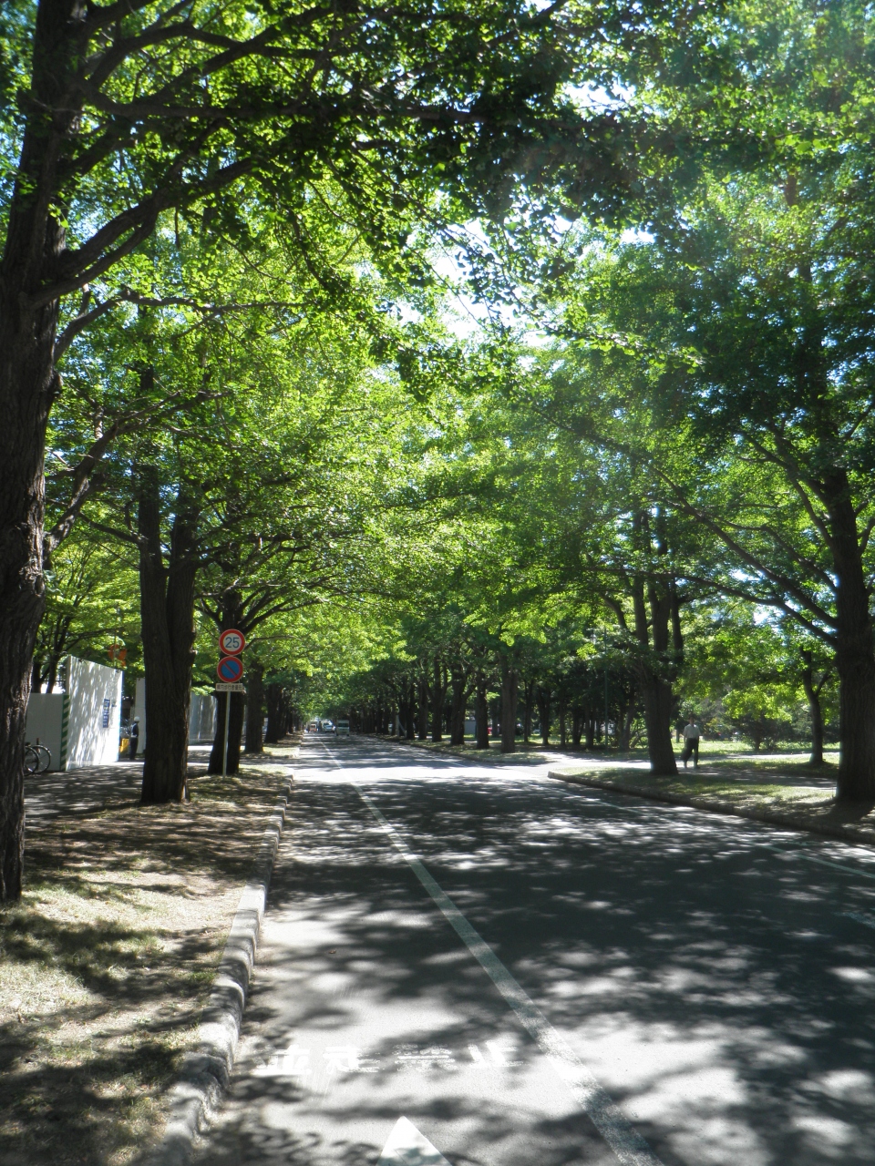 札幌の北海道大学のキャンパスの観光スポットのひとつ、イチョウ並木は7月になって葉っぱが茂って夏らしくなっていました。 昼間、歩いていると暑いです。13条門から入って、イチョウ並木を抜けて工学部前で左に曲がると、大野池、博物館、ポプラ並木があります。 7月には大学構内で緑のビアガーデンや、8月には北大マルシェが農学部前で開催されるそうです。