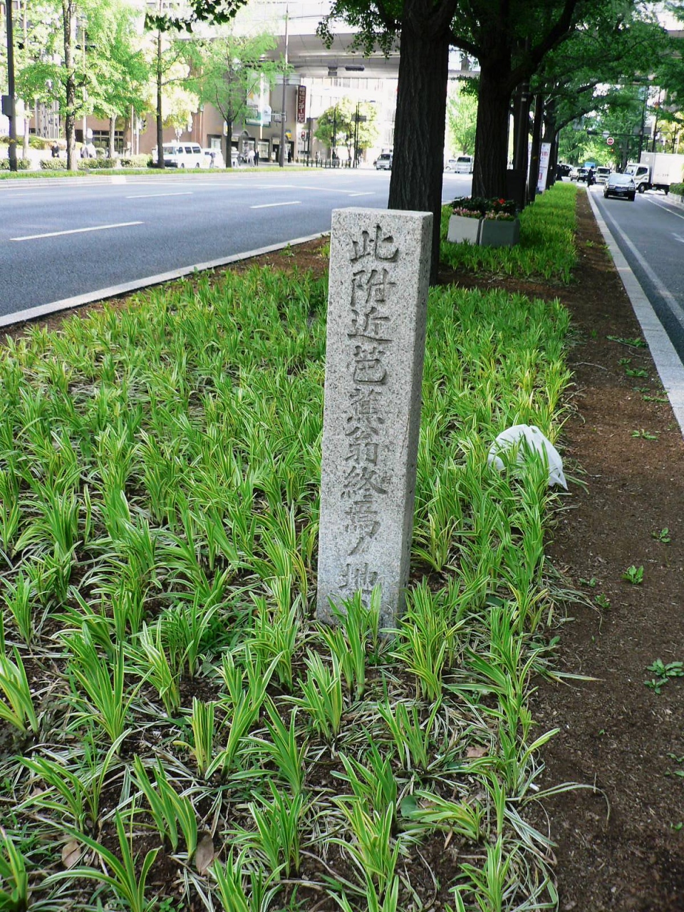 御堂筋の緑地帯の中にある「此附近芭蕉翁終焉の地」記念碑