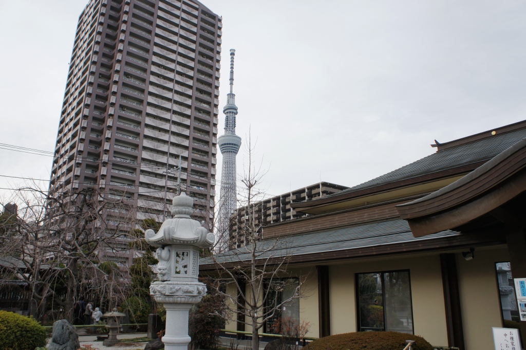 お寺や神社が連なる亀戸で横十間川にあるのが、江戸時代、萩寺と呼ばれた龍眼寺です。創建は1395年というから室町時代。わき水で洗顔すると目がよくなるといわれたことから龍眼寺と名付けられました。江戸の初期には百種類もの萩が境内に植えられたそうです。時代は下って、現代。萩をたくさん植えられるほどの広大な境内はさすがに無理。どちらかという小さめの本堂に、ちょこっとだけ萩が見られる庭。布袋さんもまつられてました。というわけで、一番、気になったのが、境内から見える東京スカイツリーでした。