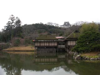 彦根城の西の丸から階段を下って内堀を渡った先に玄宮園の入り口がありました。彦根城の観覧料にこの庭園の入園料も含まれているので寄ってみると、回遊式庭園の中央の池お橋を渡るとに茶室がありました。庭園の池は外堀につながっています。