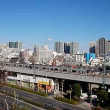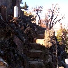 京浜急行が高架になったとき南番場駅と北番場駅の中間の川の上に出来た新番場駅の近くの第一京浜の反対側にある品川神社には、台地の末端の斜面を利用して富士塚があり、先に登っていきます。溶岩を模したボク石が積み上げられて、急な階段は意外と高度感があります。山頂は平らで、高架を通る京浜急行の電車が良く見えます。