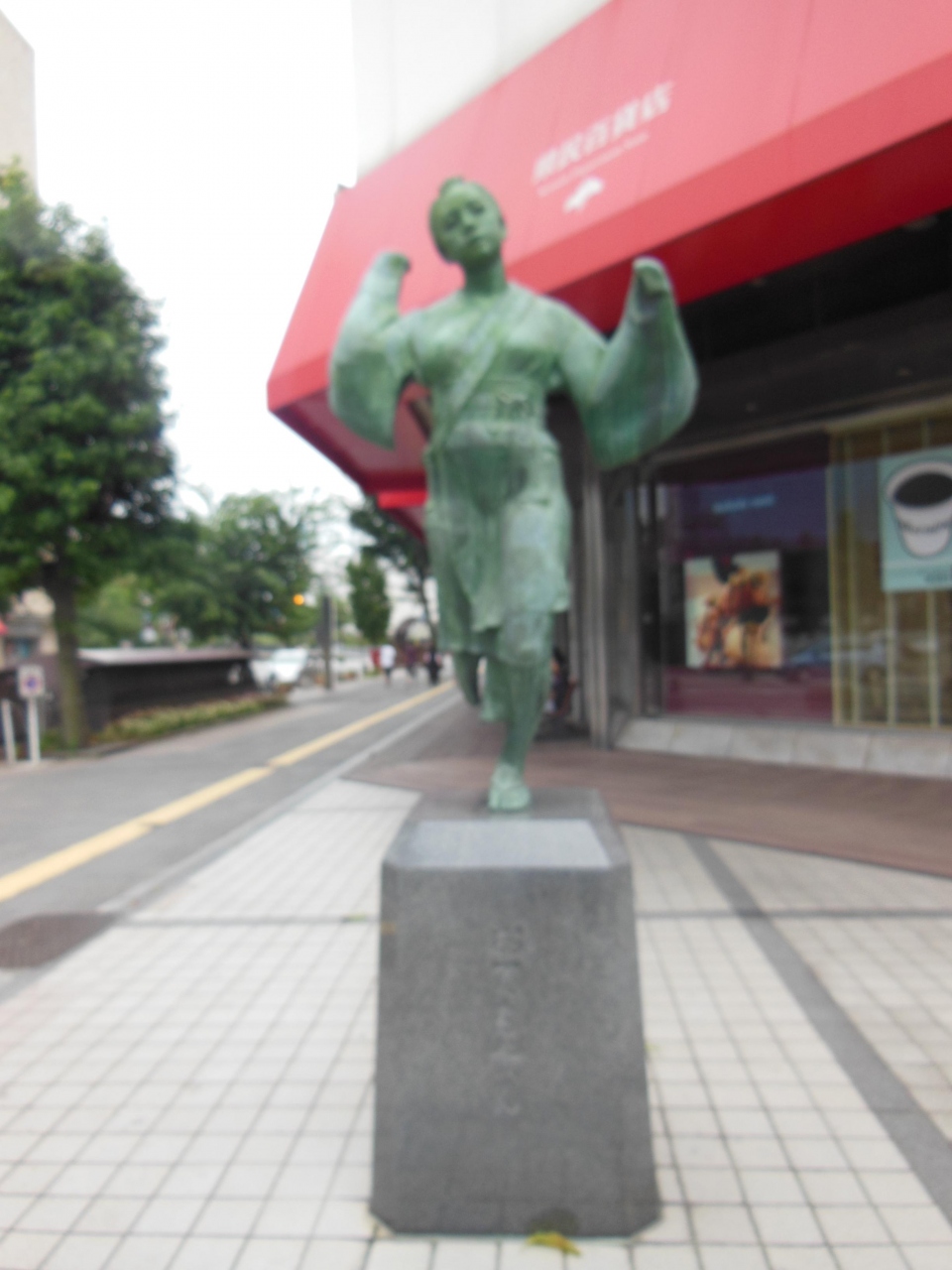 熊本の交通センターの前の広場で県民百貨店の前に建っています。民謡の中で謡われていて頬紅を濃くしたコミカルな女性を想像します。意味もわからずに小さい頃唄っていた記憶があります。気持ちが和やかになる民謡です