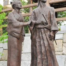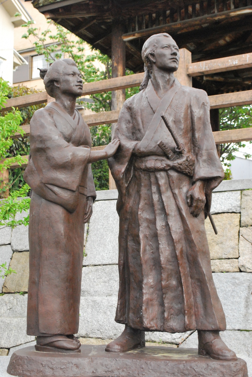 坂本龍馬と妻のお龍が日本初の新婚旅行に出発した地とされる京都市伏見区の宇治川支流船着き場に「龍馬とお龍 愛の旅路」像はあります(京都府京都市伏見区表町)