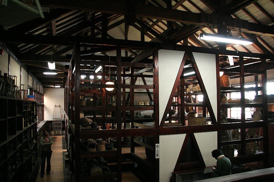 農具、看板、焼物、レトロな電化製品など、とにかく大量の古民具が集められ、背の高い棚にギッシリと詰め込まれて展示されています。その展示方法はまるで激安の殿堂ドンキホーテのよう(笑)