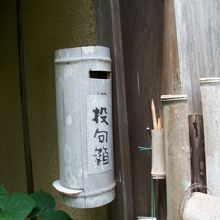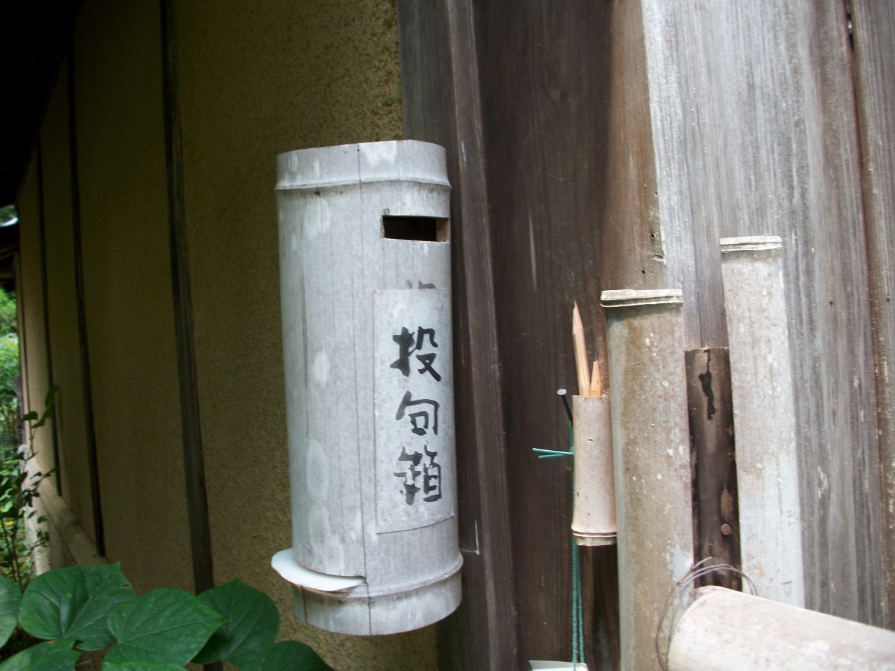 周りの田園風景の中に佇む茅葺屋根の草庵で、昔ながらの嵯峨野の風景で感じさせます。ここは敷地も小さいのですぐに見て回れます。敷地内に竹製の「句投箱」と紙と鉛筆が備え付けられていますが、普段から俳句に親しんでいる方は一句浮かぶのかも知れませんが、普通の人はここに来たからすぐに一句浮かぶものではないような気がします。