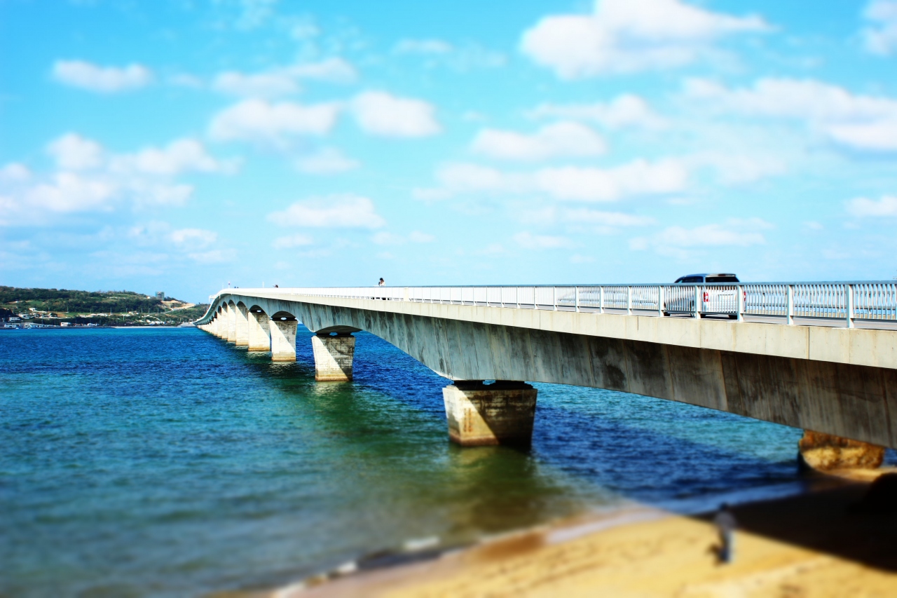 古宇利島へ渡るためのまっすぐな橋、両脇はソーダ水のようなきれいな海なので運転中はよそ見注意です。