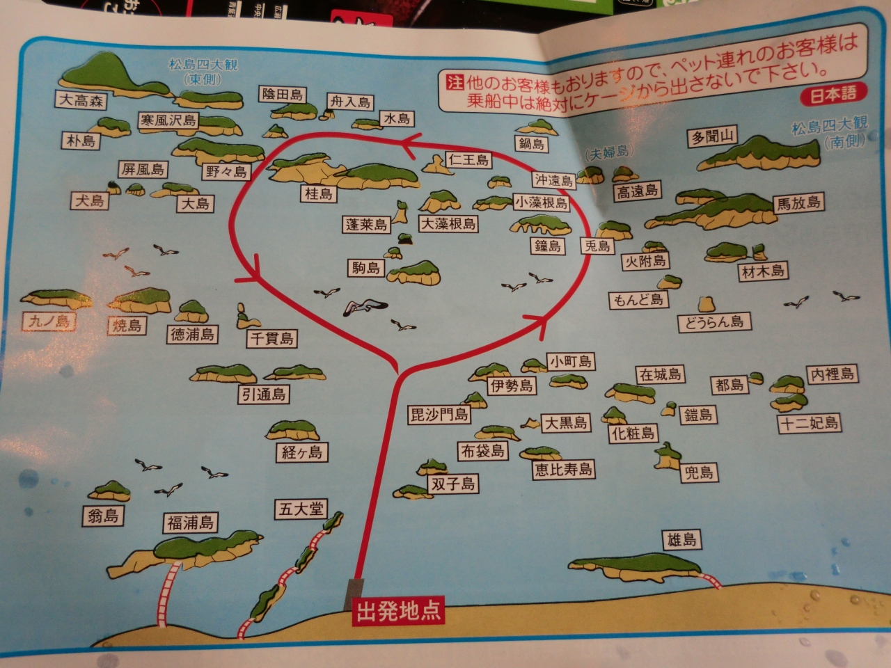 北海道から飛行機に乗って夫婦で旅行に行きました。仙台空港でレンタカーを借りて、区高速道路を使用して約1時間の距離です。ここでは遊覧船に乗り(大人一人1400円)松島湾の景色を見ました。当日はあいにくの雨でしたが、それでもきれいな景色でした。