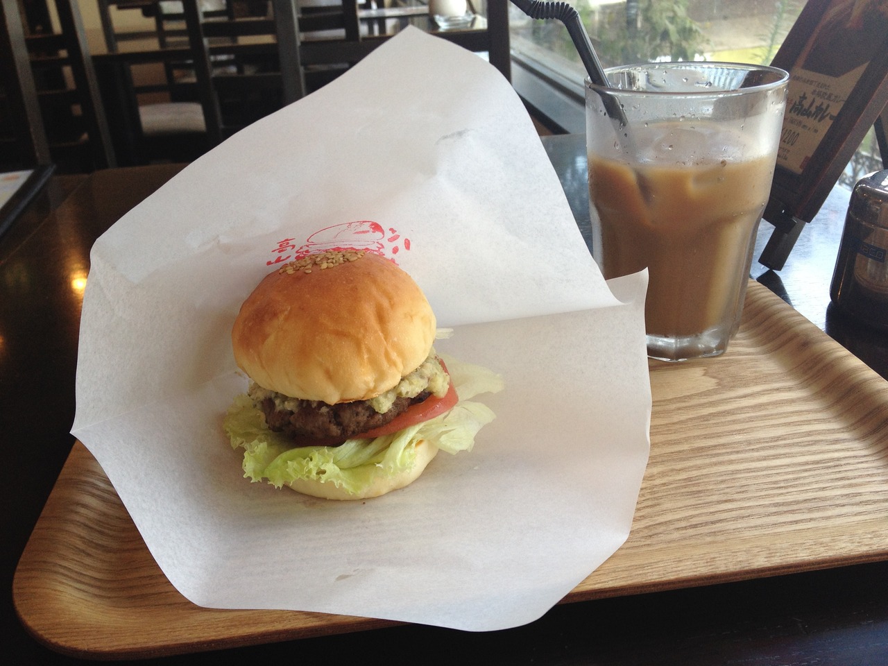 旅の最後に、宮川を眺めながら、アイスコーヒーと高山バーガーを楽しみました。